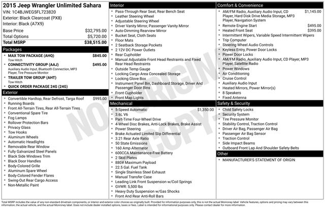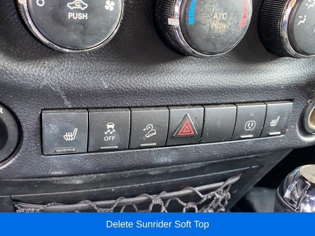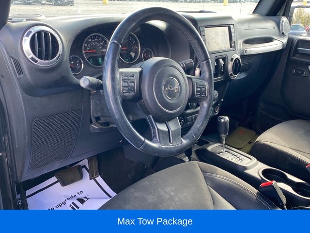 3.73 Rear Axle Ratio, Black 3-Piece Hard Top, Connectivity Group, Delete Sunrider Soft Top, Freedom Panel Storage Bag, GPS Navigation, Max Tow Package, Rear Window Defroster, Rear Window Wiper/Washer, Speed control, Tire Pressure Monitoring Display, Trailer Tow Group, Vehicle Information Center, 18" x 7.5" Polished Satin Carbon Wheels, 4-Wheel Disc Brakes, 40GB Hard Drive w/28GB Available, 5-Year SIRIUSXM Travel Link Service, 6.5" Touch Screen Display, 8 Speakers, ABS brakes, Air Conditioning, Alloy wheels, AM/FM radio, Audio Jack Input for Mobile Devices, Auto-dimming Rear-View mirror, Brake assist, CD player, Class II Receiver Hitch, Cloth Bucket Seats, Compass, Driver door bin, Driver vanity mirror, Dual front impact airbags, Electronic Stability Control, Front anti-roll bar, Front Bucket Seats, Front Center Armrest w/Storage, Front fog lights, Front reading lights, Fully automatic headlights, Heated door mirrors, Heated Front Seats, Heavy Duty Suspension w/Gas Shocks, Illuminated entry, Integrated roll-over protection, Leather steering wheel, Leather Wrapped Steering Wheel, Low tire pressure warning, Manufacturer's Statement of Origin, Occupant sensing airbag, Outside temperature display, Panic alarm, Passenger door bin, Passenger vanity mirror, Power door mirrors, Power steering, Power windows, Quick Order Package 24G, Radio data system, Radio: Uconnect 130 AM/FM/CD/MP3, Radio: Uconnect 430N CD/DVD/MP3/HDD/NAV, Rear anti-roll bar, Remote keyless entry, Remote Start System, Remote USB Port, Security system, SIRIUSXM Travel Link, Split folding rear seat, Steering wheel mounted audio controls, Sunrider Soft Top, Tachometer, Tilt steering wheel, Traction control, Trailer Tow w/4-Pin Connector Wiring, Trip computer, Variably intermittent wipers, 3.73 Rear Axle Ratio, Black 3-Piece Hard Top, Connectivity Group, Delete Sunrider Soft Top, Freedom Panel Storage Bag, GPS Navigation, Max Tow Package, Rear Window Defroster, Rear Window Wiper/Washer, Speed control, Tire Pressure Monitoring Display, Trailer Tow Group, Vehicle Information Center.