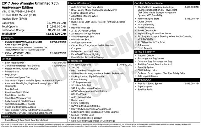Powered by a robust 3.6L V6 engine mated to a 5-speed automatic transmission, this Wrangler Unlimited Sahara delivers exceptional 4WD capability and an impressive 20 highway MPG. Elevate your off-road adventures with the Dual Top Group, which provides both a premium black soft top and a sleek black hard top for year-round versatility.