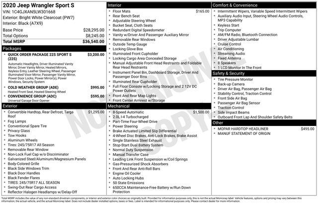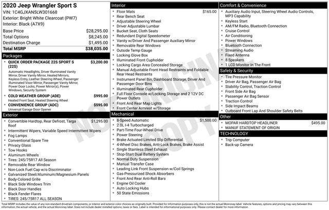 Cold Weather Group, Convenience Group, Heated Front Seats, Heated Steering Wheel, Universal Garage Door Opener, 110 mph Vehicle Max Speed Calibration, 3.45 Rear Axle Ratio, 4-Wheel Disc Brakes, 8 Speakers, ABS brakes, Air Conditioning, AM/FM radio, Automatic Headlamps, Aux Battery, Black 3-Piece Hard Top, Brake assist, Cloth Low-Back Bucket Seats, Compass, Deep Tint Sunscreen Windows, Delay-off headlights, Driver door bin, Driver vanity mirror, Dual front impact airbags, Dual front side impact airbags, Electronic Stability Control, Freedom Panel Storage Bag, Front 1-Touch Down Power Windows, Front anti-roll bar, Front Bucket Seats, Front Center Armrest w/Storage, Front fog lights, Front reading lights, Integrated roll-over protection, Leather Wrapped Steering Wheel, Low tire pressure warning, Manuf Statement of Origin, MOPAR All-Weather Floor Mats (DISC), MOPAR Hardtop Headliner, No Soft Top, Non-Lock Fuel Cap w/o Discriminator, Normal Duty Suspension, Occupant sensing airbag, Outside temperature display, ParkView Rear Back-Up Camera, Passenger door bin, Passenger vanity mirror, Power Heated Mirrors, Power steering, Quick Order Package 22S Sport S, R1234YF A/C Refrigerant, Radio data system, Radio: Uconnect 3 w/5" Display, Rear anti-roll bar, Rear reading lights, Rear Window Defroster, Rear Window Wiper/Washer, Remote Keyless Entry, Security Alarm, Speed control, Speed Sensitive Power Locks, Steering wheel mounted audio controls, Stop-Start Dual Battery System, Sun Visors w/Illuminated Vanity Mirrors, Tachometer, Telescoping steering wheel, Tilt steering wheel, Traction control, Trip computer, Variably intermittent wipers, Wheels: 17" x 7.5" Black Steel Styled, Wheels: 17" x 7.5" Tech Silver Aluminum, Cold Weather Group, Convenience Group, Heated Front Seats, Heated Steering Wheel, Universal Garage Door Opener.