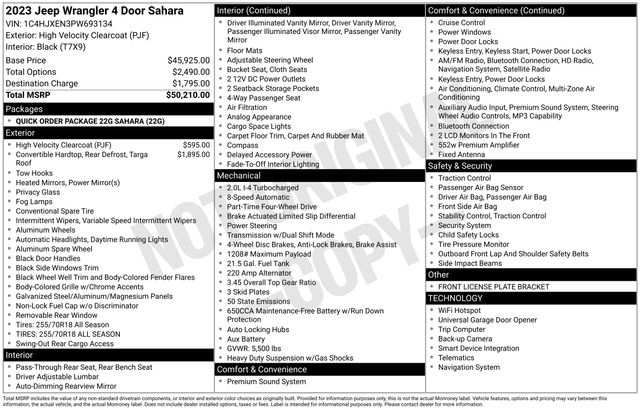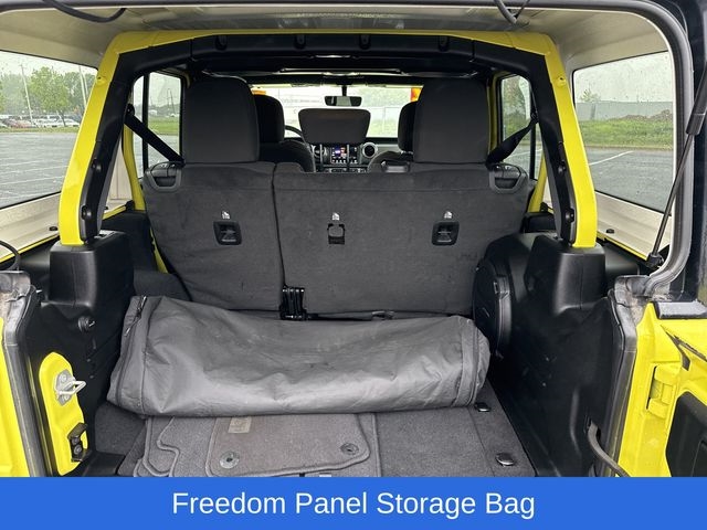 Apple CarPlay/Android Auto, Black 3-Piece Hard Top, Freedom Panel Storage Bag, Navigation System, No Soft Top, ParkView Rear Back-Up Camera, Quick Order Package 22G Sahara, Rear Window Defroster, Rear Window Wiper/Washer, Speed control, Wheels: 18" x 7.5" Machined w/Gray Spokes, 3.45 Overall Top Gear Ratio, 4-Wheel Disc Brakes, 9 Speakers, ABS brakes, Air Conditioning, Alloy wheels, AM/FM radio: SiriusXM, Auto-dimming Rear-View mirror, Automatic temperature control, Aux Battery, Brake assist, Cloth Low-Back Bucket Seats, Compass, Delay-off headlights, Driver door bin, Driver vanity mirror, Dual front impact airbags, Dual front side impact airbags, Electronic Stability Control, Emergency communication system: SiriusXM Guardian, Front anti-roll bar, Front Bucket Seats, Front Center Armrest w/Storage, Front dual zone A/C, Front fog lights, Front License Plate Bracket, Front reading lights, Fully automatic headlights, Garage door transmitter, Heated door mirrors, Heavy Duty Suspension w/Gas Shocks, Illuminated entry, Integrated roll-over protection, Low tire pressure warning, Non-Lock Fuel Cap w/o Discriminator, Occupant sensing airbag, Outside temperature display, Panic alarm, Passenger door bin, Passenger vanity mirror, Power door mirrors, Power steering, Power windows, Radio data system, Radio: Uconnect 4C Nav w/8.4" Display, Rear anti-roll bar, Rear reading lights, Remote keyless entry, Security system, Split folding rear seat, Steering wheel mounted audio controls, Stop-Start Dual Battery System, Tachometer, Telescoping steering wheel, Tilt steering wheel, Traction control, Trip computer, Variably intermittent wipers, Voltmeter, One Owner, Apple CarPlay/Android Auto, Black 3-Piece Hard Top, Freedom Panel Storage Bag, Navigation System, No Soft Top, ParkView Rear Back-Up Camera, Quick Order Package 22G Sahara, Rear Window Defroster, Rear Window Wiper/Washer, Speed control, Wheels: 18" x 7.5" Machined w/Gray Spokes.