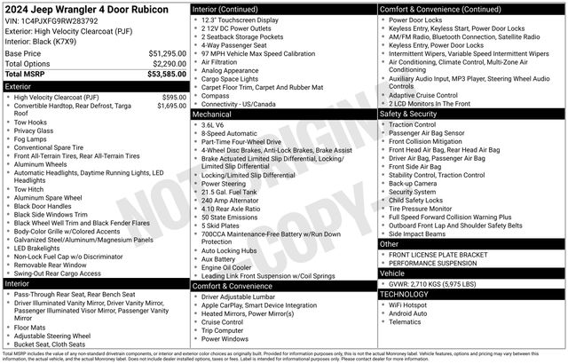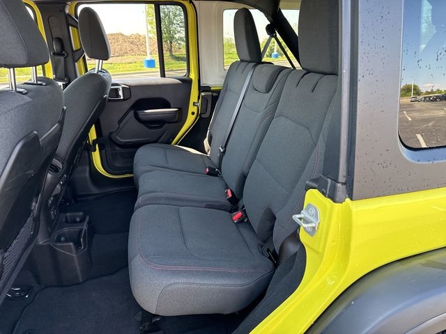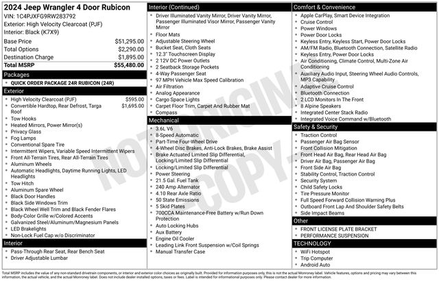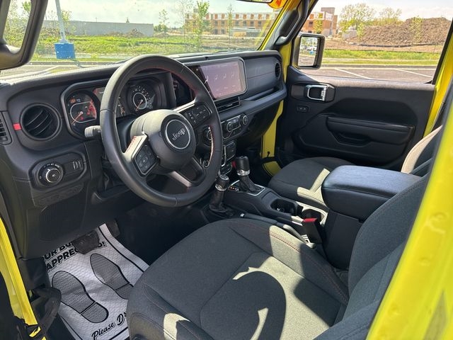 12.3" Touchscreen Display, 4-Wheel Disc Brakes, 4.10 Rear Axle Ratio, 8 Speakers, 97 MPH Vehicle Max Speed Calibration, ABS brakes, Air Conditioning, Alloy wheels, AM/FM radio: SiriusXM, Apple CarPlay, Apple CarPlay/Android Auto, Automatic temperature control, Aux Battery, Black 3-Piece Hard Top, Brake assist, Cloth Low-Back Bucket Seats, Compass, Connectivity - US/Canada, Delay-off headlights, Disassociated Touchscreen Display, Driver door bin, Driver vanity mirror, Dual front impact airbags, Dual front side impact airbags, Electronic Stability Control, Emergency communication system: Jeep Connect, Freedom Panel Storage Bag, Front anti-roll bar, Front Bucket Seats, Front Center Armrest w/Storage, Front dual zone A/C, Front fog lights, Front License Plate Bracket, Front reading lights, Fully automatic headlights, Google Android Auto, Heated door mirrors, Illuminated entry, Integrated Center Stack Radio, Integrated roll-over protection, Integrated Voice Command w/Bluetooth, Low tire pressure warning, No Soft Top, Non-Lock Fuel Cap w/o Discriminator, Occupant sensing airbag, Outside temperature display, Overhead airbag, Panic alarm, ParkView Rear Back-Up Camera, Passenger door bin, Passenger vanity mirror, Performance Suspension, Power door mirrors, Power steering, Power windows, Quick Order Package 24R Rubicon, Radio data system, Radio: Uconnect 5 w/12.3" Display, Rear anti-roll bar, Rear reading lights, Rear Window Defroster, Rear Window Wiper/Washer, Remote keyless entry, Security system, Speed control, Split folding rear seat, Steering wheel mounted audio controls, Stop-Start Dual Battery System, Tachometer, Telescoping steering wheel, Tilt steering wheel, Traction control, Trip computer, Variably intermittent wipers, Voltmeter, Wheels: 17" x 7.5" Machined/Painted Black.