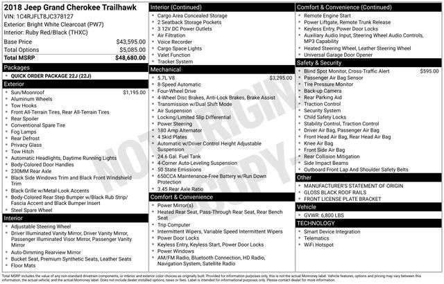 Navigation System, 10 Speakers, 230MM Rear Axle, 3.09 Rear Axle Ratio, 3.45 Rear Axle Ratio, 4-Wheel Disc Brakes, ABS brakes, Air Conditioning, Alloy wheels, AM/FM radio: SiriusXM, Anti-whiplash front head restraints, Apple CarPlay/Android Auto, Audio memory, Auto-dimming door mirrors, Auto-Dimming Exterior Passenger Mirror, Auto-dimming Rear-View mirror, Auto-leveling suspension, Automatic temperature control, Blind Spot & Cross Path Detection, Brake assist, Bumpers: body-color, Compass, Delay-off headlights, Driver door bin, Driver vanity mirror, Dual Bright Exhaust Tips, Dual front impact airbags, Dual front side impact airbags, Electronic Stability Control, Emergency communication system: SiriusXM Guardian, Engine Oil Cooler, Four wheel independent suspension, Front anti-roll bar, Front Bucket Seats, Front Center Armrest w/Storage, Front dual zone A/C, Front fog lights, Front License Plate Bracket, Front reading lights, Fully automatic headlights, Garage door transmitter, Gloss Black Roof Rails (DISC), Heated door mirrors, Heated front seats, Heated rear seats, Heated steering wheel, Heavy-Duty Engine Cooling, Illuminated entry, Knee airbag, Leather Shift Knob, Low tire pressure warning, Manufacturer's Statement of Origin, Memory seat, Normal Duty Suspension - Increased Travel, Occupant sensing airbag, Outside temperature display, Overhead airbag, Overhead console, Panic alarm, ParkView Rear Back-Up Camera, Passenger door bin, Passenger vanity mirror, Power door mirrors, Power driver seat, Power Liftgate, Power passenger seat, Power steering, Power Sunroof (DISC), Power windows, Quadra-Trac II 4WD System, Quick Order Package 22J, Radio data system, Radio: Uconnect 4C Nav w/8.4" Display, Rear anti-roll bar, Rear reading lights, Rear seat center armrest, Rear window defroster, Rear window wiper, Remote keyless entry, Roof rack: rails only, Security system, Speed control, Speed-Sensitive Wipers, Split folding rear seat, Spoiler, Steering wheel mounted audio controls, Tachometer, Telescoping steering wheel, Tilt steering wheel, Traction control, Trailhawk Leather/Suede Seats, Trip computer, Turn signal indicator mirrors, Variably intermittent wipers, Ventilated front seats, Wheels: 18" x 8.0" Off Road Aluminum, Navigation System.