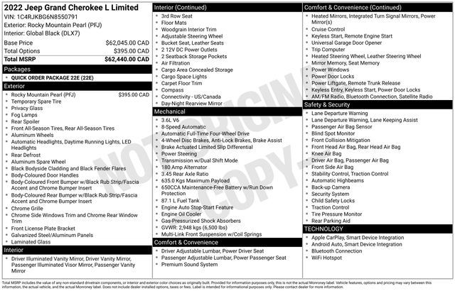 3.45 Rear Axle Ratio, 3rd row seats: split-bench, 4-Wheel Disc Brakes, 4G LTE Wi-Fi Hot Spot, 6 Speakers, ABS brakes, Active Noise Control System, Air Conditioning, Alloy wheels, AM/FM radio: SiriusXM with 360L, Anti-whiplash front head restraints, Apple CarPlay, Audio memory, Auto High-beam Headlights, Automatic temperature control, Brake assist, Bumpers: body-color, Capri Leather Seats, Compass, Connectivity - US/Canada, Delay-off headlights, Disassociated Touchscreen Display, Driver door bin, Driver vanity mirror, Dual front impact airbags, Dual front side impact airbags, Electronic Stability Control, Emergency communication system, For Details, Visit DriveUconnect.com, For More Info, Call 800-643-2112, Four wheel independent suspension, Front anti-roll bar, Front Bucket Seats, Front Center Armrest w/Storage, Front dual zone A/C, Front fog lights, Front reading lights, Fully automatic headlights, Garage door transmitter, Global Telematics Box Module (TBM), Google Android Auto, GPS Antenna Input, Heated door mirrors, Heated front seats, Heated rear seats, Heated steering wheel, Illuminated entry, Integrated Center Stack Radio, Integrated Voice Command w/Bluetooth, Knee airbag, Leather steering wheel, Low tire pressure warning, Manual Fold Seatbacks, Memory seat, Normal Duty Suspension, Occupant sensing airbag, Outside temperature display, Overhead airbag, Overhead console, Panic alarm, ParkView Rear Back-Up Camera, Passenger door bin, Passenger vanity mirror, Power door mirrors, Power driver seat, Power Liftgate, Power passenger seat, Power steering, Power windows, Quick Order Package 22E, Radio data system, Radio: Uconnect 5 w/8.4" Display, Rear air conditioning, Rear anti-roll bar, Rear reading lights, Rear window defroster, Rear window wiper, Reclining 3rd row seat, Remote keyless entry, Security system, SiriusXM Radio Service, SiriusXM Satellite Radio, SiriusXM w/360L, Speed control, Speed-Sensitive Wipers, Split folding rear seat, Spoiler, Steering wheel mounted audio controls, Tachometer, Telescoping steering wheel, Tilt steering wheel, Traction control, Trip computer, Turn signal indicator mirrors, USB Host Flip, Variably intermittent wipers, Voltmeter, Wheels: 18" x 8.0" Fully Painted Aluminum 2.