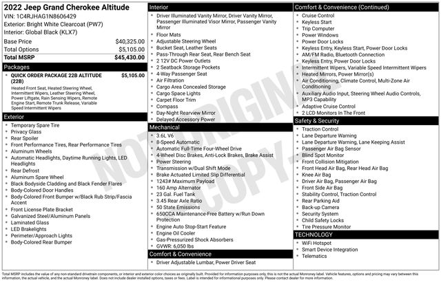 Altitude Appearance Package, 115V Auxiliary Power Outlet, 3.45 Rear Axle Ratio, 4-Wheel Disc Brakes, 6 Speakers, ABS brakes, Air Conditioning, Alloy wheels, Anti-whiplash front head restraints, Automatic temperature control, Black Headliner, Brake assist, Bumpers: body-color, Cloth Seats, Compass, Delay-off headlights, Delete Laredo Badge, Driver door bin, Driver vanity mirror, Dual front impact airbags, Dual front side impact airbags, Electronic Stability Control, Emergency communication system, Four wheel independent suspension, Front anti-roll bar, Front Bucket Seats, Front Center Armrest w/Storage, Front dual zone A/C, Front reading lights, Fully automatic headlights, Gloss Black Exterior Accents, Heated door mirrors, Heated Front Seats, Heated Steering Wheel, Illuminated entry, Knee airbag, Leather steering wheel, Leather Trimmed Bucket Seats, Leather Wrapped Steering Wheel, Low tire pressure warning, Molded In Color Black/Gloss Black Roof Rails, Normal Duty Suspension, Occupant sensing airbag, Outside temperature display, Overhead airbag, Overhead console, Panic alarm, ParkView Rear Back-Up Camera, Passenger door bin, Passenger vanity mirror, Power door mirrors, Power driver seat, Power Liftgate, Power steering, Power windows, Quick Order Package 22B Altitude, Radio data system, Radio: Uconnect 5 w/8.4" Display, Rain Sensitive Windshield Wipers, Rear anti-roll bar, Rear reading lights, Rear window defroster, Rear window wiper, Remote keyless entry, Remote Start System, Roof rack: rails only, Secondary Active Grille Shutters, Security system, Selectable Tire Fill Alert, Speed control, Speed-Sensitive Wipers, Split folding rear seat, Spoiler, Steering wheel mounted audio controls, Tachometer, Telescoping steering wheel, Tilt steering wheel, Traction control, Trip computer, Variably intermittent wipers, Voltmeter, Wheels: 17" x 6.5" Fully Painted Aluminum, Wheels: 20" x 8.5" Gloss Black Painted Aluminum, Wireless Charging Pad, Altitude Appearance Package.