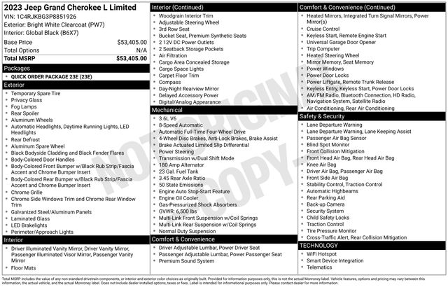 Navigation System, 3.45 Rear Axle Ratio, 3rd row seats: split-bench, 4-Wheel Disc Brakes, 6 Speakers, ABS brakes, Active Noise Control System, Air Conditioning, Alloy wheels, AM/FM radio: SiriusXM with 360L, Anti-whiplash front head restraints, Audio memory, Auto High-beam Headlights, Automatic temperature control, Brake assist, Bumpers: body-color, Capri Leatherette Seats, Compass, Delay-off headlights, Driver door bin, Driver vanity mirror, Dual front impact airbags, Dual front side impact airbags, Electronic Stability Control, Emergency communication system, Four wheel independent suspension, Front anti-roll bar, Front Bucket Seats, Front Center Armrest w/Storage, Front dual zone A/C, Front fog lights, Front reading lights, Fully automatic headlights, Garage door transmitter, Heated door mirrors, Heated front seats, Heated rear seats, Heated steering wheel, Illuminated entry, Knee airbag, Low tire pressure warning, Manual Fold Seatbacks, Memory seat, Molded In Color Black/Gloss Black Roof Rails, Normal Duty Suspension, Occupant sensing airbag, Outside temperature display, Overhead airbag, Overhead console, Panic alarm, ParkView Rear Back-Up Camera, Passenger door bin, Passenger vanity mirror, Power door mirrors, Power driver seat, Power Liftgate, Power passenger seat, Power steering, Power windows, Quick Order Package 23E, Radio data system, Radio: Uconnect 5 Nav w/10.1" Display, Rear air conditioning, Rear anti-roll bar, Rear reading lights, Rear window defroster, Rear window wiper, Reclining 3rd row seat, Remote keyless entry, Security system, Speed control, Speed-Sensitive Wipers, Split folding rear seat, Spoiler, Steering wheel mounted audio controls, Tachometer, Telescoping steering wheel, Tilt steering wheel, Traction control, Trip computer, Turn signal indicator mirrors, Variably intermittent wipers, Voltmeter, Wheels: 18" x 8.0" Fully Painted Aluminum, Navigation System.