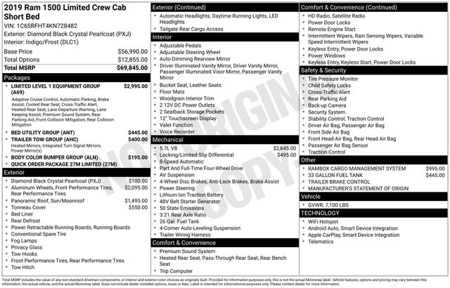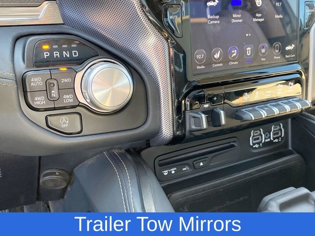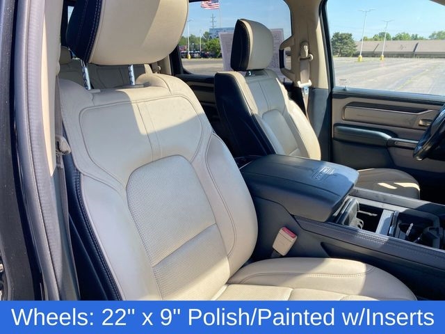 HEMI 5.7L V8 Multi Displacement VVT, 4 Adjustable Cargo Tie-Down Hooks, Adaptive Cruise Control w/Stop & Go, Advanced Brake Assist, Apple CarPlay, Bed Utility Group, Dome Dual LED Reading Lamp, Dual-Pane Panoramic Sunroof, Full Speed Forward Collision Warning Plus, GPS Navigation, harman/kardon 19 Speaker Premium Sound, Heated front seats, Lane Keep Assist, LED Dome/Reading Lamp, Limited Level 1 Equipment Group, Navigation System, Parallel & Perp Park Assist w/Stop, ParkView Rear Back-Up Camera, Pick-Up Box Lighting, Power Chrome Trailer Tow Mirrors, Quick Order Package 27M Limited, RamBox Cargo Management System, Trailer Brake Control, Trailer Tow Group, Trailer Tow Mirrors, Ventilated Rear Seats, Wheels: 22" x 9" Polish/Painted w/Inserts, 1-Yr SiriusXM Guardian Trial, 10 Speakers, 12" Touchscreen Display, 3.21 Rear Axle Ratio, 33 Gallon Fuel Tank, 4-Wheel Disc Brakes, 48V Belt Starter Generator, ABS brakes, Adjustable pedals, Air Conditioning, Alloy wheels, AM/FM radio: SiriusXM with 360L, Anti-Spin Differential Rear Axle, Apple CarPlay/Android Auto, Audio memory, Auto High-beam Headlights, Auto-dimming door mirrors, Auto-dimming Rear-View mirror, Auto-leveling suspension, Automatic temperature control, Body Color Bumper Group, Body Color Rear Bumper w/Step Pads, Bodyside moldings, Brake assist, Bumpers: chrome, Compass, Delay-off headlights, Disassociated Touchscreen Display, Driver door bin, Driver vanity mirror, Dual front impact airbags, Dual front side impact airbags, Electronic Stability Control, Emergency communication system: SiriusXM Guardian, Front anti-roll bar, Front Bucket Seats, Front Center Armrest w/Storage, Front dual zone A/C, Front fog lights, Front reading lights, Front wheel independent suspension, Fully automatic headlights, Garage door transmitter, Genuine wood console insert, Genuine wood dashboard insert, Genuine wood door panel insert, Google Android Auto, GPS Antenna Input, HD Radio, Heated door mirrors, Heated rear seats, Heated steering wheel, Illuminated entry, Integrated Center Stack Radio, Leather steering wheel, Low tire pressure warning, Manufacturer's Statement of Origin, Memory seat, Occupant sensing airbag, Outside temperature display, Overhead airbag, Overhead console, Panic alarm, Passenger door bin, Passenger vanity mirror, Pedal memory, Power door mirrors, Power driver seat, Power passenger seat, Power steering, Power windows, Premium Leather Trimmed Bucket Seats, Radio data system, Radio: Uconnect 12 w/Navigation, Rain sensing wipers, Rear anti-roll bar, Rear seat center armrest, Rear step bumper, Rear window defroster, Remote CD player, Remote keyless entry, Security system, SiriusXM Satellite Radio, SiriusXM Traffic Plus, SiriusXM Travel Link, SiriusXM w/360L, Speed control, Split folding rear seat, Steering wheel mounted audio controls, Tachometer, Telescoping steering wheel, Tilt steering wheel, Traction control, Trip computer, Turn signal indicator mirrors, USB Host Flip, Variably intermittent wipers, Ventilated front seats, Voltmeter, Wheels: 20" x 9" Polished w/Inserts, Clean Carfax, 5.7L HEMI V8 ENGINE, HEMI 5.7L V8 Multi Displacement VVT, 4 Adjustable Cargo Tie-Down Hooks, Adaptive Cruise Control w/Stop & Go, Advanced Brake Assist, Apple CarPlay, Bed Utility Group, Dome Dual LED Reading Lamp, Dual-Pane Panoramic Sunroof, Full Speed Forward Collision Warning Plus, GPS Navigation, harman/kardon 19 Speaker Premium Sound, Heated front seats, Lane Keep Assist, LED Dome/Reading Lamp, Limited Level 1 Equipment Group, Navigation System, Parallel & Perp Park Assist w/Stop, ParkView Rear Back-Up Camera, Pick-Up Box Lighting, Power Chrome Trailer Tow Mirrors, Quick Order Package 27M Limited, RamBox Cargo Management System, Trailer Brake Control, Trailer Tow Group, Trailer Tow Mirro