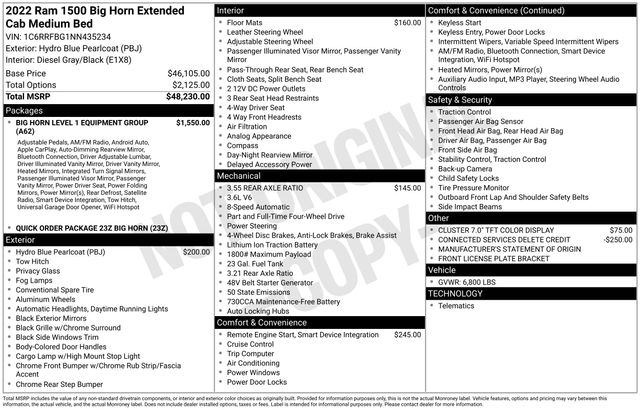 4G LTE Wi-Fi Hot Spot, 8.4" Touchscreen Display, Apple CarPlay, Auto-Dimming Exterior Driver Mirror, Auto-Dimming Rear-View Mirror, Big Horn Level 1 Equipment Group, Black Exterior Mirrors, Black Premium Power Mirrors, Bluetooth Handsfree Phone & Audio, Class IV Receiver Hitch, Connectivity - US/Canada, Convex Wide-Angle Mirror Insert, Exterior Mirrors Courtesy Lamps, Exterior Mirrors w/Heating Element, Exterior Mirrors w/Supplemental Signals, For Details, Visit DriveUconnect.com, For More Info, Call 800-643-2112, Global Telematics Box Module (TBM), Glove Box Lamp, Google Android Auto, GPS Antenna Input, Integrated Center Stack Radio, Power 2-Way Driver Lumbar Adjust, Power 8-Way Driver Seat, Power Adjustable Pedals, Power-Folding Mirrors, Radio: Uconnect 5 W w/8.4" Display, Rear Dome w/On/Off Switch Lamp, Rear Power Sliding Window, Rear Window Defroster, SiriusXM Radio Service, SiriusXM Satellite Radio, Sun Visors w/Illuminated Vanity Mirrors, Universal Garage Door Opener, USB Host Flip, 3 Rear Seat Head Restraints, 4 Way Front Headrests, 4-Wheel Disc Brakes, 48V Belt Starter Generator, 6 Speakers, ABS brakes, Air Conditioning, Alloy wheels, AM/FM radio, Big Horn Badge, Brake assist, Bumpers: chrome, Cloth Bench Seat, Cluster 7.0" TFT Color Display, Compass, Connected Services Delete Credit, Delay-off headlights, Driver door bin, Dual front impact airbags, Dual front side impact airbags, Electronic Stability Control, Emergency communication system: SiriusXM Guardian, Front anti-roll bar, Front Center Armrest w/Storage, Front fog lights, Front License Plate Bracket, Front reading lights, Front Seat Back Map Pockets, Front wheel independent suspension, Fully automatic headlights, Heated door mirrors, Illuminated entry, Integrated Voice Command w/Bluetooth, Leather steering wheel, Low tire pressure warning, Manual Adjust 4-Way Front Passenger Seat, Manufacturer's Statement of Origin, MOPAR Front & Rear Rubber Floor Mats, Occupant sensing airbag, Outside temperature display, Overhead airbag, Overhead console, Panic alarm, ParkView Rear Back-Up Camera, Passenger door bin, Passenger vanity mirror, Power door mirrors, Power steering, Power windows, Quick Order Package 23Z Big Horn, Radio data system, Radio: Uconnect 3 w/5" Display, Rear 60/40 Folding Seat, Rear anti-roll bar, Rear seat center armrest, Rear step bumper, Remote keyless entry, Remote Start System, Speed control, Split folding rear seat, Steering wheel mounted audio controls, Tachometer, Telescoping steering wheel, Tilt steering wheel, Traction control, Trip computer, Variably intermittent wipers, Voltmeter, Wheels: 18" x 8" Cast-Aluminum Painted, 4G LTE Wi-Fi Hot Spot, 8.4" Touchscreen Display, Apple CarPlay, Auto-Dimming Exterior Driver Mirror, Auto-Dimming Rear-View Mirror, Big Horn Level 1 Equipment Group, Black Exterior Mirrors, Black Premium Power Mirrors, Bluetooth Handsfree Phone & Audio, Class IV Receiver Hitch, Connectivity - US/Canada, Convex Wide-Angle Mirror Insert, Exterior Mirrors Courtesy Lamps, Exterior Mirrors w/Heating Element, Exterior Mirrors w/Supplemental Signals, For Details, Visit DriveUconnect.com, For More Info, Call 800-643-2112, Global Telematics Box Module (TBM), Glove Box Lamp, Google Android Auto, GPS Antenna Input, Integrated Center Stack Radio, Power 2-Way Driver Lumbar Adjust, Power 8-Way Driver Seat, Power Adjustable Pedals, Power-Folding Mirrors, Radio: Uconnect 5 W w/8.4" Display, Rear Dome w/On/Off Switch Lamp, Rear Power Sliding Window, Rear Window Defroster, SiriusXM Radio Service, SiriusXM Satellite Radio, Sun Visors w/Illuminated Vanity Mirrors, Universal Garage Door Opener, USB Host Flip.
