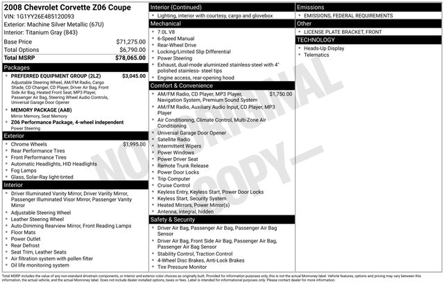 7.0L V8 SFI, Driver & Front Passenger Heated Seats, Driver & Passenger Frontal & Side-Impact Airbags, Enhanced Acoustic Package, Luggage Shade, Manual Tilt/Power Telescoping Steering Column, Memory Package, Rear Compartment Area Cargo Net, Steering Wheel Mounted Audio Controls, Universal Home Remote, Z06 Preferred Equipment Group, 3.42 Limited Slip Rear Axle Ratio, 4-Wheel Disc Brakes, 7 Speakers, ABS brakes, Air Conditioning, Alloy wheels, AM/FM radio: XM, AM/FM Stereo w/CD/Navigation/XM Satellite, Auto-dimming door mirrors, Auto-dimming Rear-View mirror, Automatic temperature control, Bumpers: body-color, CD player, Compass, Custom Two-Tone Leather Wrapped Seating Surfaces, Delay-off headlights, Driver door bin, Driver vanity mirror, Dual front impact airbags, Electronic Stability Control, Emergency communication system: OnStar Safe & Sound, Four wheel independent suspension, Front anti-roll bar, Front Bucket Seats, Front Center Armrest, Front dual zone A/C, Front fog lights, Front License Plate Bracket, Front reading lights, Fully automatic headlights, Heads-Up Display, Heated door mirrors, High-Intensity Discharge Headlights, Illuminated entry, Leather Shift Knob, Leather steering wheel, Low tire pressure warning, Occupant sensing airbag, Outside temperature display, Panic alarm, Passenger door bin, Passenger vanity mirror, Power door mirrors, Power driver seat, Power steering, Power windows, Radio data system, Rear anti-roll bar, Rear window defroster, Remote keyless entry, Security system, Speed control, Speed-sensing steering, Spoiler, Sport steering wheel, Tachometer, Tilt steering wheel, Traction control, Trip computer, Variably intermittent wipers, Voltmeter, XM Satellite Radio, 7.0L V8 SFI, Driver & Front Passenger Heated Seats, Driver & Passenger Frontal & Side-Impact Airbags, Enhanced Acoustic Package, Luggage Shade, Manual Tilt/Power Telescoping Steering Column, Memory Package, Rear Compartment Area Cargo Net, Steering Wheel Mounted Audio Controls, Universal Home Remote, Z06 Preferred Equipment Group.