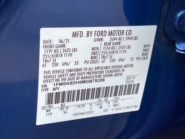 Class III Trailer Tow Package, Evasive Steering Assist, Ford Co-Pilot360 Assist+, Intelligent Adaptive Cruise Control, SelectShift Capability w/Paddle Shifters, Speed Sign Recognition, Voice-Activated Touchscreen Navigation System, 1st Row Heated Seats, 3.58 Non-Limited-Slip Rear Axle Ratio, 3rd row seats: bench, 4-Wheel Disc Brakes, 6 Speakers, ABS brakes, Acoustic-Laminated Front Side Windows, ActiveX Captain's Chairs, Air Conditioning, Alloy wheels, AM/FM radio: SiriusXM, AM/FM Stereo, Auto High-beam Headlights, Automatic temperature control, Brake assist, Bumpers: body-color, Cargo Area Management System, Compass, Delay-off headlights, Driver door bin, Driver vanity mirror, Dual front impact airbags, Dual front side impact airbags, Electronic Stability Control, Emergency communication system: SYNC 3 911 Assist, Equipment Group 202A, Exterior Parking Camera Rear, FordPass Connect, Four wheel independent suspension, Front anti-roll bar, Front Bucket Seats, Front Center Armrest, Front dual zone A/C, Front reading lights, Fully automatic headlights, Heated door mirrors, Heated front seats, Heated Steering Wheel, Illuminated entry, Knee airbag, Leather steering wheel, LED Fog Lamps, Low tire pressure warning, Occupant sensing airbag, Outside temperature display, Overhead airbag, Overhead console, Panic alarm, Passenger door bin, Passenger vanity mirror, Power door mirrors, Power driver seat, Power Liftgate, Power passenger seat, Power steering, Power windows, Rear air conditioning, Rear anti-roll bar, Rear reading lights, Rear window defroster, Rear window wiper, Remote keyless entry, Remote Start System, Roof rack: rails only, Security system, Speed control, Speed-sensing steering, Speed-Sensitive Wipers, Split folding rear seat, Spoiler, Steering wheel mounted audio controls, SYNC 3 Communications & Entertainment System, SYNC 3/Apple CarPlay/Android Auto, Tachometer, Telescoping steering wheel, Tilt steering wheel, Traction control, Trip computer, Unique Cloth Captain's Chairs, Variably intermittent wipers, Wheels: 18" 5-Spoke Sparkle Silver-Painted Alum, Class III Trailer Tow Package, Evasive Steering Assist, Ford Co-Pilot360 Assist+, Intelligent Adaptive Cruise Control, SelectShift Capability w/Paddle Shifters, Speed Sign Recognition, Voice-Activated Touchscreen Navigation System.