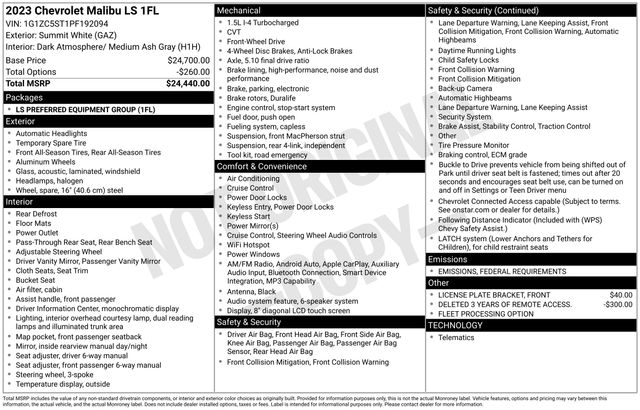16" Aluminum Wheels, 4-Wheel Disc Brakes, 6 Speakers, 6-Speaker Audio System Feature, 6-Way Manual Driver Seat Adjuster, 6-Way Manual Front Passenger Seat Adjuster, ABS brakes, Air Conditioning, Alloy wheels, AM/FM radio, Apple CarPlay/Android Auto, Auto High-beam Headlights, Brake assist, Bumpers: body-color, Compass, Delay-off headlights, Deleted 3 Years of Remote Access, Driver door bin, Driver vanity mirror, Dual front impact airbags, Dual front side impact airbags, Electronic Stability Control, Emergency communication system: OnStar and Chevrolet connected services capable, Exterior Parking Camera Rear, Four wheel independent suspension, Front anti-roll bar, Front Bucket Seats, Front Center Armrest, Front License Plate Bracket, Front reading lights, Fully automatic headlights, Illuminated entry, Knee airbag, Low tire pressure warning, Occupant sensing airbag, Outside temperature display, Overhead airbag, Overhead console, Panic alarm, Passenger door bin, Passenger vanity mirror, Power door mirrors, Power steering, Power windows, Preferred Equipment Group 1FL, Premium audio system: Chevrolet Infotainment 3, Premium Cloth Seat Trim, Radio data system, Radio: Chevrolet Infotainment 3 System, Rear anti-roll bar, Rear side impact airbag, Rear window defroster, Remote keyless entry, Security system, Speed control, Split folding rear seat, Steering wheel mounted audio controls, Tachometer, Telescoping steering wheel, Tilt steering wheel, Traction control, Trip computer, Variably intermittent wipers, Voltmeter, Wireless Apple CarPlay/Android Auto.