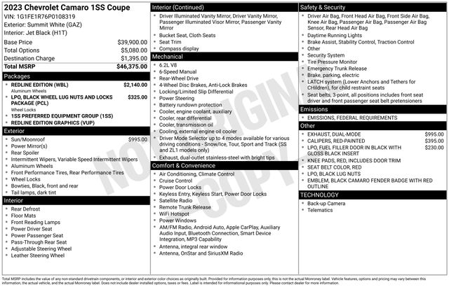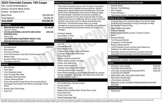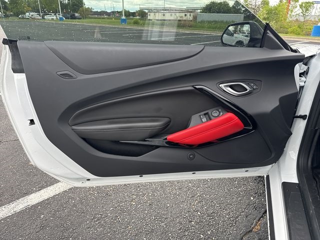 Black Camaro Emblem Fender Badge w/Red Outline, Power Sunroof, Red Knee Pads, Red Seat Belt Color, Redline Edition, Redline Edition Graphics, Wheels: 20" x 8.5"Fr/20" x 9.5" Rr Aluminum, 4-Wheel Disc Brakes, 6 Speakers, 6-Speaker Audio System Feature, 6-Way Power Front Passenger Seat Adjuster, 8-Way Power Driver Seat Adjuster, ABS brakes, Air Conditioning, Alloy wheels, Apple CarPlay/Android Auto, Automatic temperature control, Black Fuel Filler Door w/Gloss Black Insert (LPO), Black Lug Nuts (LPO), Black Wheel Locks (LPO), Black Wheel Lug Nuts & Locks Package (LPO), Bluetooth® For Phone, Brake assist, Bumpers: body-color, Cloth Seat Trim, Compass, Delay-off headlights, Driver door bin, Driver vanity mirror, Dual front impact airbags, Dual front side impact airbags, Dual Mode Exhaust, Electronic Stability Control, Exterior Parking Camera Rear, Four wheel independent suspension, Front anti-roll bar, Front Bucket Seats, Front Center Armrest, Front reading lights, Front Sport Bucket Seats, Fully automatic headlights, Illuminated entry, Knee airbag, Leather Shift Knob, Low tire pressure warning, Occupant sensing airbag, Overhead airbag, Panic alarm, Passenger door bin, Passenger vanity mirror, Power door mirrors, Power driver seat, Power passenger seat, Power steering, Power windows, Premium audio system: Chevrolet Infotainment System, Radio data system, Radio: Chevrolet Infotainment 3 Plus System, Rear anti-roll bar, Rear window defroster, Red-Painted Calipers, Remote keyless entry, Security system, SiriusXM w/360L, Speed control, Speed-sensing steering, Steering wheel mounted audio controls, Tachometer, Telescoping steering wheel, Tilt steering wheel, Traction control, Trip computer, Variably intermittent wipers, Voltmeter, Black Camaro Emblem Fender Badge w/Red Outline, Power Sunroof, Red Knee Pads, Red Seat Belt Color, Redline Edition, Redline Edition Graphics, Wheels: 20" x 8.5"Fr/20" x 9.5" Rr Aluminum.