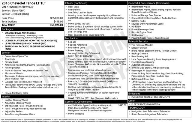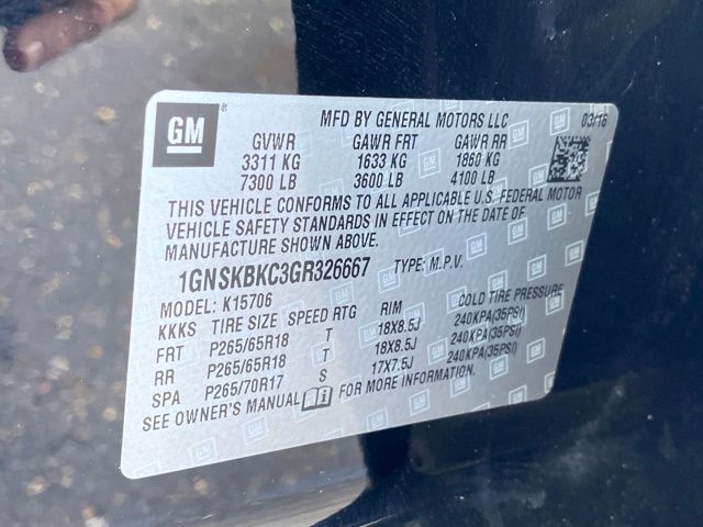 4WD, Black Leather, 18" x 8.5" Aluminum Wheels, 1st & 2nd Row Color-Keyed Carpeted Floor Mats, 2nd Row 60/40 Split-Folding Manual Bench, 3.08 Rear Axle Ratio, 3rd Row Manual 60/40 Split-Folding Fold Flat Bench, 3rd row seats: split-bench, 4-Wheel Antilock Disc Brakes, 4-Wheel Disc Brakes, 5 12-Volt Auxiliary Power Outlets, 6-Way Power Front Passenger Seat Adjuster, 9 Speakers, ABS brakes, Adjustable pedals, Air Conditioning, Alloy wheels, AM/FM radio: SiriusXM, Apple CarPlay, Auto High-beam Headlights, Auto-Dimming Inside Rear-View Mirror, Auto-dimming Rear-View mirror, Automatic temperature control, Black Assist Steps, Bose Premium 9-Speaker System, Brake assist, Bumpers: body-color, CD player, Color-Keyed Carpeting Floor Covering, Compass, Delay-off headlights, Driver door bin, Driver Inboard & Front Passenger Airbags, Driver vanity mirror, Dual front impact airbags, Dual front side impact airbags, Electronic Cruise Control w/Set & Resume Speed, Electronic Stability Control, Emergency communication system: OnStar, Enhanced Driver Instrument Information Display, Extended-Range Remote Keyless Entry, Exterior Parking Camera Rear, Floor Console, Forward Collision Alert Sensor Indicator, Front anti-roll bar, Front Bucket Seats, Front Center Armrest, Front dual zone A/C, Front Heated Reclining Bucket Seats, Front reading lights, Front wheel independent suspension, Fully automatic headlights, Garage door transmitter, Heated door mirrors, Heated front seats, Illuminated entry, IntelliBeam Headlamps, Lane Departure Warning System, Lane Keep Assist, Leather-Appointed Seat Trim, Leather-Wrapped Steering Wheel, License Plate Front Mounting Package, Low tire pressure warning, Memory seat, Memory Settings, Occupant sensing airbag, OnStar Basic Plan For 5 Years, Outside temperature display, Overhead airbag, Overhead console, Panic alarm, Passenger door bin, Passenger vanity mirror, Pedal memory, Power door mirrors, Power driver seat, Power Liftgate, Power passenger seat, Power steering, Power windows, Power-Adjustable Accelerator & Brake Pedals, Preferred Equipment Group 1LT, Premium audio system: Chevrolet MyLink, Premium Smooth Ride Suspension Package, Radio: Chevrolet MyLink AM/FM Stereo, Radio: Chevrolet MyLink w/Navigation/AM/FM Stereo, Rain sensing wipers, Rear air conditioning, Rear anti-roll bar, Rear Park Assist w/Audible Warning, Rear reading lights, Rear seat center armrest, Rear window defroster, Rear window wiper, Remote keyless entry, Roof rack: rails only, Roof-Mounted Luggage Rack Side Rails, Safety Alert Driver Seat, Security system, Single-Slot CD/MP3 Player, SiriusXM Satellite Radio, Speed control, Speed-sensing steering, Split folding rear seat, Spoiler, Steering wheel mounted audio controls, Tachometer, Telescoping steering wheel, Tilt steering wheel, Traction control, Trip computer, Unauthorized Entry Electrical Theft Deterrent Sys., Universal Home Remote, Variably intermittent wipers, Voltmeter, 4WD, Black Leather.