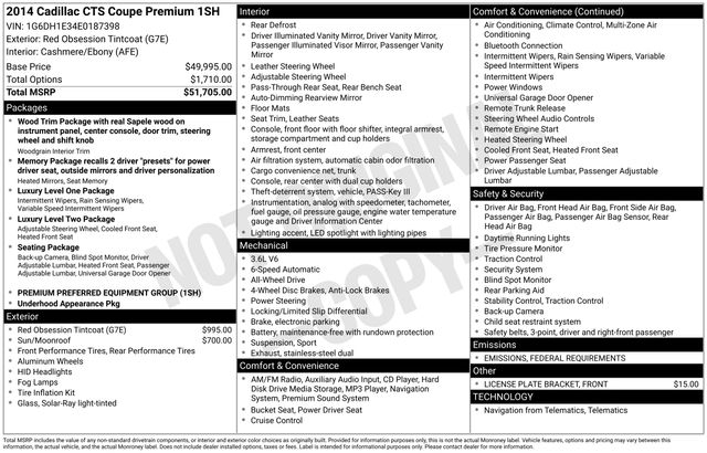 10 Speakers, 18" x 8.5" Fr/18" x 9.0" Rr High Polished Wheels, 2-Way Power Driver/Front Passenger Lumbar Control, 4-Wheel Disc Brakes, ABS brakes, Air Conditioning, Air Filtration System, Alloy wheels, AM/FM radio: SiriusXM, Anti-whiplash front head restraints, Auto tilt-away steering wheel, Auto-dimming Rear-View mirror, Automatic temperature control, Bluetooth® For Phone, Brake assist, Bumpers: body-color, CD player, Compass, Delay-off headlights, Driver door bin, Driver vanity mirror, Dual front impact airbags, Dual front side impact airbags, DVD-Audio, Electronic Stability Control, Emergency communication system: OnStar Directions & Connections, Exterior Parking Camera Rear, Fog Lamps, Four wheel independent suspension, Front anti-roll bar, Front Bucket Seats, Front Center Armrest w/Storage, Front dual zone A/C, Front fog lights, Front License Plate Bracket, Front reading lights, Fully automatic headlights, Garage door transmitter, Genuine wood console insert, Genuine wood dashboard insert, Genuine wood door panel insert, Heated door mirrors, Heated front seats, Heated Steering Wheel, Heated steering wheel, Heated/Ventilated Driver & Front Passenger Seats, High-Intensity Discharge Headlamps, High-Intensity Discharge Headlights, Illuminated entry, Leather Seating Surfaces, Leather Shift Knob, Leather steering wheel, Leather-Wrapped Steering Wheel Rim, LED Spotlight w/Lighting Pipes, Low tire pressure warning, Luxury Level One Package, Luxury Level Two Package, Memory Package, Memory seat, Navigation System, Occupant sensing airbag, Outside temperature display, Overhead airbag, Overhead console, Panic alarm, Passenger door bin, Passenger vanity mirror, Power door mirrors, Power driver seat, Power passenger seat, Power Rake/Telescopic Steering Wheel Column, Power steering, Power Tilt-To-Open Sunroof w/Power Sunshade, Power windows, Preferred Equipment Group 1SH, Radio data system, Radio: AM/FM Stereo w/Single-Slot CD/DVD/Nav, Rain sensing wipers, Rainsense Wipers, Rear anti-roll bar, Rear reading lights, Rear seat center armrest, Rear Vision Camera, Rear window defroster, Remote keyless entry, Remote Vehicle Start, Seating Package, Security system, Side Blind Zone Alert, SIRIUSXM Satellite Radio, Speed control, Speed-sensing steering, Split folding rear seat, Steering wheel memory, Steering wheel mounted audio controls, Tachometer, Telescoping steering wheel, Theft-Deterrent System, Tilt steering wheel, Traction control, Trip computer, Trunk Cargo Convenience Net, Underhood Appearance Package, Universal Home Remote, Variably intermittent wipers, Ventilated front seats, Voltmeter, Wood Trim Package.