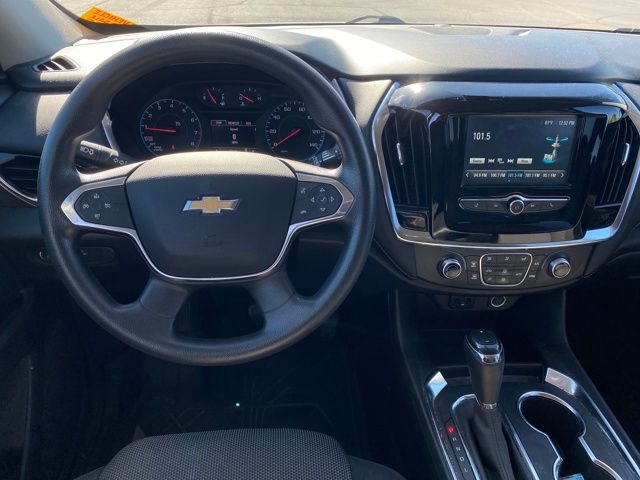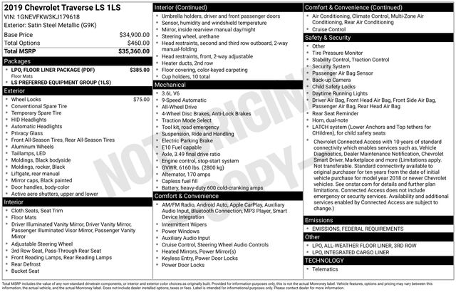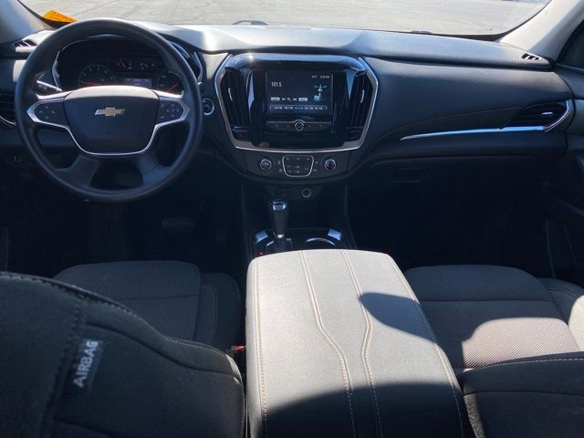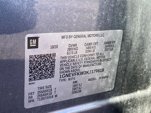 1st & 2nd Row All-Weather Floor Liner (LPO), 3.49 Axle Ratio, 3rd Row All-Weather Floor Liner (LPO), 3rd row seats: split-bench, 4-Wheel Disc Brakes, 6 Speakers, 8-Passenger Seating (2-3-3 Seating Configuration), ABS brakes, Air Conditioning, Alloy wheels, AM/FM radio, Apple CarPlay/Android Auto, Automatic temperature control, Brake assist, Bumpers: body-color, Compass, Delay-off headlights, Driver door bin, Driver vanity mirror, Dual front impact airbags, Dual front side impact airbags, Electronic Stability Control, Emergency communication system, Floor Liner Package (LPO), Four wheel independent suspension, Front anti-roll bar, Front Bucket Seats, Front Center Armrest, Front dual zone A/C, Front reading lights, Fully automatic headlights, Heated door mirrors, High-Intensity Discharge Headlights, Illuminated entry, Integrated Cargo Liner (LPO), Low tire pressure warning, Occupant sensing airbag, Outside temperature display, Overhead airbag, Overhead console, Panic alarm, Passenger door bin, Passenger vanity mirror, Power door mirrors, Power steering, Power windows, Preferred Equipment Group 1LS, Premium Cloth Seat Trim, Radio data system, Radio: Chevrolet Infotainment System AM/FM Stereo, Rear air conditioning, Rear anti-roll bar, Rear reading lights, Rear window defroster, Rear window wiper, Remote keyless entry, Security system, Speed control, Speed-sensing steering, Split folding rear seat, Spoiler, Steering wheel mounted audio controls, Tachometer, Telescoping steering wheel, Tilt steering wheel, Traction control, Trip computer, Variably intermittent wipers, Voltmeter, Wheel Locks, Wheels: 18" Bright Silver Painted Aluminum.
