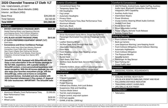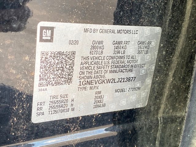 Automatic Emergency Braking, Automatic Heated Steering Wheel, Driver Confidence II Package, Following Distance Indicator, Forward Collision Alert, Front Pedestrian Braking, IntelliBeam Auto High Beam Control Headlamps, Lane Keep Assist w/Lane Departure Warning, 3.49 Axle Ratio, 3rd row seats: split-bench, 4-Wheel Disc Brakes, 6 Speakers, 7-Passenger Seating (2-2-3 Seating Configuration), ABS brakes, Air Conditioning, Alloy wheels, AM/FM radio: SiriusXM, Apple CarPlay/Android Auto, Automatic temperature control, Black Accent Package (LPO), Black Finish Grille (LPO), Black Lug Nut & Wheel Lock Kit (LPO), Brake assist, Bumpers: body-color, Compass, Delay-off headlights, Driver door bin, Driver vanity mirror, Dual front impact airbags, Dual front side impact airbags, Electronic Stability Control, Emergency communication system: OnStar and Chevrolet connected services capable, Four wheel independent suspension, Front & Rear Black Bowtie Emblems (LPO), Front anti-roll bar, Front Bucket Seats, Front Center Armrest, Front dual zone A/C, Front fog lights, Front reading lights, Fully automatic headlights, Garage door transmitter, Heated door mirrors, Heated front seats, Heavy-Duty Cooling System, High-Intensity Discharge Headlights, Hitch Guidance w/Hitch View, Illuminated entry, Leather steering wheel, Low tire pressure warning, Occupant sensing airbag, Outside temperature display, Overhead airbag, Overhead console, Panic alarm, Passenger door bin, Passenger vanity mirror, Power door mirrors, Power driver seat, Power Liftgate, Power steering, Power windows, Preferred Equipment Group 1LT, Premium Cloth Seat Trim, Radio data system, Radio: Chevrolet Infotainment 3 Plus System, Rear air conditioning, Rear anti-roll bar, Rear reading lights, Rear window defroster, Rear window wiper, Remote keyless entry, Roof rack: rails only, Security system, SiriusXM w/360L, Speed control, Speed-sensing steering, Spoiler, Steering wheel mounted audio controls, Tachometer, Telescoping steering wheel, Tilt steering wheel, Traction control, Trailering Assist Guidelines, Trailering Equipment, Trip computer, Turn signal indicator mirrors, Variably intermittent wipers, Voltmeter, Wheels: 18" Bright Silver Painted Aluminum, Wheels: 20" Gloss Black Painted Aluminum (LPO), Wheels: 20" x 8" Aluminum Transit, Automatic Emergency Braking, Automatic Heated Steering Wheel, Driver Confidence II Package, Following Distance Indicator, Forward Collision Alert, Front Pedestrian Braking, IntelliBeam Auto High Beam Control Headlamps, Lane Keep Assist w/Lane Departure Warning.