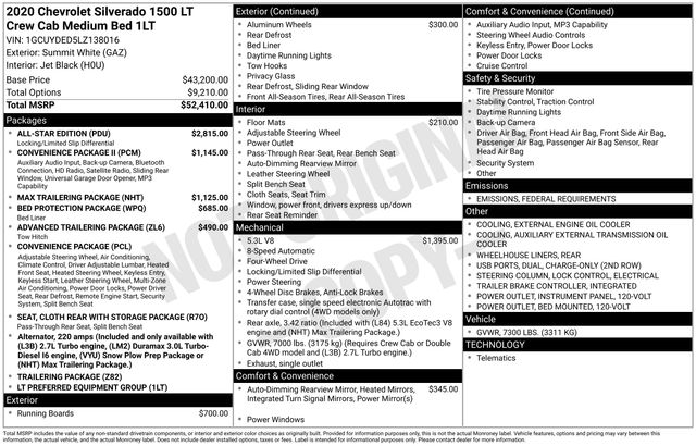 10-Way Power Driver Seat w/Lumbar, 12-Volt Rear Auxiliary Power Outlet, 120-Volt Instrument Panel Power Outlet, 2 USB Ports, 220 Amps Alternator, 3.42 Rear Axle Ratio, 40/20/40 Front Split-Bench Seat, Advanced Trailering Package, Advanced Trailering System, Convenience Package, Convenience Package II, Dual-Zone Automatic Climate Control, Electric Rear-Window Defogger, Electrical Lock Control Steering Column, Enhanced Cooling Radiator, EZ Lift Power Lock & Release Tailgate, HD Radio, HD Rear Vision Camera, Heated Driver & Front Outboard Passenger Seats, Heated Steering Wheel, Heavier Duty Rear Springs, Hitch Guidance w/Hitch View, Increased RGAWR, Integrated Trailer Brake Controller, Keyless Open & Start, Leather Wrapped Steering Wheel, LED Cargo Area Lighting, Manual Tilt/Telescoping Steering Column, Max Trailering Package, Power Sliding Rear Window w/Rear Defogger, Radio: Chevrolet Infotainment 3 Plus System, Rear Dual USB Charging-Only Ports, Remote Vehicle Starter System, SiriusXM w/360L, 120-Volt Bed Mounted Power Outlet, 2 USB Ports (First Row), 4-Way Manual Driver Seat Adjuster, 4-Wheel Disc Brakes, 4.2" Diagonal Color Display Driver Info Center, 40/20/40 Front Split Bench Seat, 4G LTE Wi-Fi Hot Spot Capable, 6 Speakers, ABS brakes, Air Conditioning, All-Star Edition, All-Weather Floor Liner (LPO), Alloy wheels, Apple CarPlay/Android Auto, Auto-Dimming Inside Rear-View Mirror, Auxiliary External Transmission Oil Cooler, Bed Protection Package, Bluetooth® For Phone, Brake assist, Bumpers: chrome, Chevrolet Connected Access Capable, Chevytec Spray-On Black Bedliner, Chrome Assist Steps, Chrome Grille, Chrome Mirror Caps, Cloth Rear Seat w/Storage Package, Cloth Seat Trim, Color-Keyed Carpeting Floor Covering, Compass, Deep-Tinted Glass, Delay-off headlights, Driver door bin, Driver vanity mirror, Dual front impact airbags, Dual front side impact airbags, Electronic Stability Control, External Engine Oil Cooler, Front anti-roll bar, Front Center Armrest w/Storage, Front Frame-Mounted Black Recovery Hooks, Front reading lights, Front Rubberized Vinyl Floor Mats, Front wheel independent suspension, Fully automatic headlights, Heated door mirrors, Heavy Duty Suspension, Heavy-Duty Rear Locking Differential, Hitch Guidance, Illuminated entry, Locking Tailgate, Low tire pressure warning, Manual Tilt-Wheel Steering Column, Occupant sensing airbag, OnStar & Chevrolet Connected Services Capable, Outside temperature display, Overhead airbag, Overhead console, Panic alarm, Passenger door bin, Passenger vanity mirror, Power Door Locks, Power door mirrors, Power Front Windows w/Driver Express Up/Down, Power Front Windows w/Passenger Express Down, Power Rear Windows w/Express Down, Power steering, Power windows, Preferred Equipment Group 1LT, Pwr-Adjustable Vertical Trailering Outside Mirrors, Radio data system, Radio: Chevrolet Infotainment 3 System, Rear 60/40 Folding Bench Seat (Folds Up), Rear reading lights, Rear Rubberized-Vinyl Floor Mats, Rear step bumper, Rear Vision Camera, Rear Wheelhouse Liners, Remote Keyless Entry, Remote keyless entry, Single-Zone Manual/Semi-Automatic Air Conditioning, Speed control, Speed-sensing steering, Split folding rear seat, Steering Wheel Audio Controls, Steering wheel mounted audio controls, Steering Wheel Mounted Electronic Cruise Control, Tachometer, Theft Deterrent System (Unauthorized Entry), Tilt steering wheel, Traction control, Trailering Package, Trip computer, Universal Home Remote, Urethane Steering Wheel, Variably intermittent wipers, Voltmeter, Wheels: 17" x 8" Bright Silver Painted Aluminum, Wheels: 18" x 8.5" Bright Silver Painted Aluminum, 10-Way Power Driver Seat w/Lumbar, 12-Volt Rear Auxiliary Power Outlet, 120-Volt Instrument Panel Power Outlet, 2 USB Ports, 220 Amps Alternator, 3.42 Rear Axle Ratio, 40/20/40 Front
