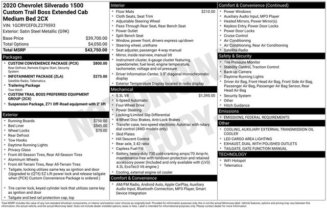 Custom Convenience Package, Electric Rear-Window Defogger, EZ Lift Power Lock & Release Tailgate, Infotainment Package, LED Cargo Area Lighting, OnStar & Chevrolet Connected Services Capable, Remote Vehicle Starter System, SiriusXM Radio, 170 Amps Alternator, 3.42 Rear Axle Ratio, 3.5" Diagonal Monochromatic Display, 4-Wheel Disc Brakes, 4" Black Round Assist Steps (LPO), 4G LTE Wi-Fi Hot Spot Capable, 6 Speakers, ABS brakes, Air Conditioning, All-Weather Floor Liner (LPO) (AAK), Alloy wheels, Apple CarPlay/Android Auto, Auxiliary External Transmission Oil Cooler, Bluetooth® For Phone, Brake assist, Chevrolet Connected Access Capable, Chevytec Spray-On Black Bedliner, Cloth Seat Trim, Color-Keyed Carpeting Floor Covering, Compass, Deep-Tinted Glass, Delay-off headlights, Driver door bin, Driver vanity mirror, Dual Exhaust w/Polished Outlets, Dual front impact airbags, Dual front side impact airbags, Electronic Stability Control, Exterior Parking Camera Rear, Front 40/20/40 Split-Bench Seat, Front anti-roll bar, Front Center Armrest, Front reading lights, Front Rubberized Vinyl Floor Mats, Front wheel independent suspension, Fully automatic headlights, Heated door mirrors, Heavy-Duty Rear Locking Differential, High Capacity Air Filter, High Gloss Black Grille, Hill Descent Control, Hitch Guidance, Illuminated entry, Locking Tailgate, Low tire pressure warning, Manual Tilt-Wheel Steering Column, Occupant sensing airbag, Off-Road Suspension w/2" Lift, Outside temperature display, Overhead airbag, Overhead console, Panic alarm, Passenger door bin, Passenger vanity mirror, Performance Red Recovery Hooks, Polished Exhaust Tip, Power Door Locks, Power door mirrors, Power Front Windows w/Driver Express Up/Down, Power Front Windows w/Passenger Express Down, Power Rear Windows w/Express Down, Power steering, Power windows, Preferred Equipment Group 2CX, Radio data system, Radio: Chevrolet Infotainment 3 System, Rear 60/40 Folding Bench Seat (Folds Up), Rear reading lights, Rear Rubberized-Vinyl Floor Mats, Rear step bumper, Remote Keyless Entry, Remote keyless entry, Speed control, Speed-sensing steering, Split folding rear seat, Steering Wheel Mounted Electronic Cruise Control, Suspension Package, Tachometer, Theft Deterrent System (Unauthorized Entry), Tilt steering wheel, Traction control, Trailering Package, Trip computer, Variably intermittent wipers, Voltmeter, Wheel Locks (Set of 4) (LPO), Wheels: 18" x 8.5" Black Painted Aluminum, Custom Convenience Package, Electric Rear-Window Defogger, EZ Lift Power Lock & Release Tailgate, Infotainment Package, LED Cargo Area Lighting, OnStar & Chevrolet Connected Services Capable, Remote Vehicle Starter System, SiriusXM Radio.