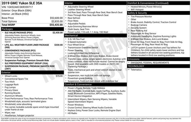 20" x 9" Polished Aluminum Wheels, Convenience Package, Inside Rear-View Auto-Dimming Mirror, Power Programmable Rear Liftgate, Power-Adjustable Pedals For Accelerator & Brake, SLE Value Package, Universal Home Remote, 3.08 Rear Axle Ratio, 3rd row seats: split-bench, 4-Wheel Antilock Disc Brakes, 4-Wheel Disc Brakes, 5 Auxiliary 12-volt Power Outlets, 9 Speakers, ABS brakes, Air Conditioning, All-Weather Floor Liner Package (LPO), Alloy wheels, AM/FM radio: SiriusXM, Apple CarPlay/Android Auto, Automatic temperature control, Black Assist Steps w/Chrome Strip, Bose Premium 9-Speaker System, Brake assist, Bumpers: body-color, CD Player, CD player, Compass, Delay-off headlights, Driver door bin, Driver vanity mirror, Dual front impact airbags, Dual front side impact airbags, Electronic Stability Control, Emergency communication system: OnStar and GMC connected services capable, Exterior Parking Camera Rear, Front anti-roll bar, Front Bucket Seats, Front Center Armrest, Front dual zone A/C, Front fog lights, Front reading lights, Front wheel independent suspension, Fully automatic headlights, Heated door mirrors, Illuminated entry, Low tire pressure warning, Manual Rear Liftgate, Occupant sensing airbag, Outside temperature display, Overhead airbag, Overhead console, Panic alarm, Passenger door bin, Passenger vanity mirror, Power door mirrors, Power driver seat, Power passenger seat, Power steering, Power windows, Preferred Equipment Group 3SA, Premium audio system: IntelliLink, Premium Cloth Seat Trim, Premium Smooth Ride Suspension Package, Radio: AM/FM/SiriusXM, Rain sensing wipers, Rear air conditioning, Rear anti-roll bar, Rear reading lights, Rear seat center armrest, Rear window defroster, Rear window wiper, Remote keyless entry, Roof rack: rails only, Security system, SiriusXM Radio, Speed control, Speed-sensing steering, Split folding rear seat, Spoiler, Steering wheel mounted audio controls, Tachometer, Tilt steering wheel, Traction control, Trip computer, Variably intermittent wipers, Voltmeter, Wheel Locks, Wheels: 18" x 8.5" Bright Machined Aluminum, 20" x 9" Polished Aluminum Wheels, Convenience Package, Inside Rear-View Auto-Dimming Mirror, Power Programmable Rear Liftgate, Power-Adjustable Pedals For Accelerator & Brake, SLE Value Package, Universal Home Remote.