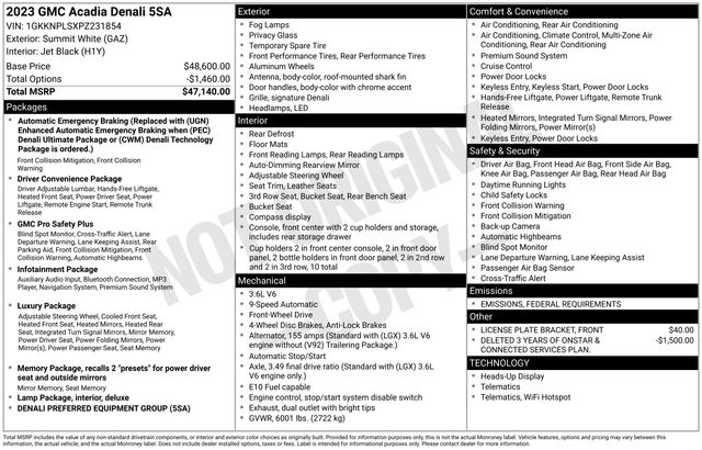 Bose Premium 8-Speaker Audio System Feature, Navigation System, 20" Ultra Bright Machined Aluminum Wheels, 3.49 Final Drive Axle Ratio, 3rd row seats: split-bench, 4-Wheel Disc Brakes, 6-Passenger (2-2-2 Seating Configuration), 7-Passenger (2-3-2 Seating Configuration), 8 Speakers, 8-Way Power Driver Seat Adjuster, 8-Way Power Passenger Seat Adjuster, ABS brakes, Air Conditioning, Alloy wheels, AM/FM radio: SiriusXM with 360L, Apple CarPlay/Android Auto, Auto High-beam Headlights, Auto-dimming door mirrors, Auto-dimming Rear-View mirror, Automatic temperature control, Brake assist, Bumpers: body-color, Compass, Delay-off headlights, Deleted 3 Years of OnStar & Connected Services Plan, Driver door bin, Driver vanity mirror, Dual front impact airbags, Dual front side impact airbags, Electronic Stability Control, Emergency communication system: OnStar and GMC connected services capable, Four wheel independent suspension, Front anti-roll bar, Front Bucket Seats, Front Center Armrest, Front dual zone A/C, Front fog lights, Front License Plate Bracket, Front reading lights, Fully automatic headlights, Garage door transmitter, Heads-Up Display, Heated & Ventilated Driver & Front Passenger Seats, Heated door mirrors, Heated Driver & Front Passenger Seats, Heated front seats, Heated Rear Outboard Seating Positions, Heated rear seats, Heated steering wheel, Illuminated entry, Knee airbag, Low tire pressure warning, Memory seat, Occupant sensing airbag, Outside temperature display, Overhead airbag, Overhead console, Panic alarm, Passenger door bin, Passenger vanity mirror, Perforated Leather-Appointed Seat Trim, Power door mirrors, Power Driver Lumbar Control Seat Adjuster, Power driver seat, Power Liftgate, Power Passenger Lumbar Control Seat Adjuster, Power passenger seat, Power steering, Power windows, Preferred Equipment Group 5SA, Radio data system, Radio: AM/FM 8" Diagonal Multi-Touch Navigation, Rear air conditioning, Rear anti-roll bar, Rear reading lights, Rear window defroster, Rear window wiper, Remote keyless entry, Security system, SiriusXM w/360L, Speed control, Speed-sensing steering, Spoiler, Steering wheel memory, Steering wheel mounted audio controls, Tachometer, Telescoping steering wheel, Tilt steering wheel, Traction control, Trip computer, Turn signal indicator mirrors, Variably intermittent wipers, Ventilated front seats, Voltmeter, Wireless Apple CarPlay/Wireless Android Auto, Bose Premium 8-Speaker Audio System Feature, Navigation System.