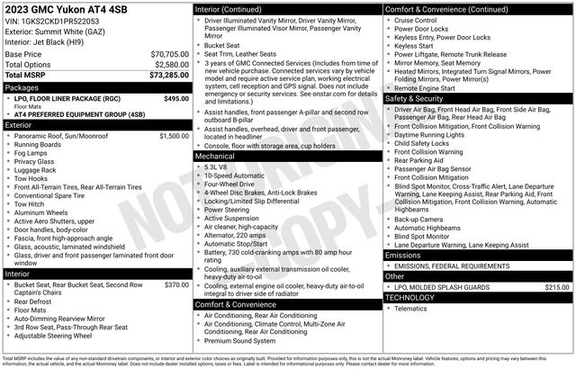 Navigation System, 1st & 2nd Rows Premium Floor Liners (LPO), 2 Presets For Outside Rearview Mirrors, 3 Years of GMC Connected Services, 3 Years of OnStar Safety & Security, 3 Years of OnStar Safety & Security (DISC), 3.23 Rear Axle Ratio, 3rd Row 60/40 Power-Folding Split-Bench Seat, 3rd Row All-Weather Floor Liners (LPO), 3rd row seats: split-bench, 4-Wheel Disc Brakes, 9 Speakers, ABS brakes, Adaptive suspension, Air Conditioning, All-Weather Cargo Mat (LPO), Alloy wheels, AM/FM radio: SiriusXM with 360L, AM/FM Stereo, Apple CarPlay/Android Auto, Auto High-beam Headlights, Auto-dimming door mirrors, Auto-dimming Rear-View mirror, Auto-leveling suspension, Automatic Emergency Braking, Automatic temperature control, Black Roof-Mounted Luggage Rack Side Rails, Bose 9-Speaker Stereo Audio System Feature, Brake assist, Bright Front & Rear Door Sill Plates, Bumpers: body-color, Compass, Delay-off headlights, Driver door bin, Driver vanity mirror, Dual front impact airbags, Dual front side impact airbags, Dual-Pane Panoramic Power Sunroof, Electronic Stability Control, Emergency communication system: OnStar and GMC connected services capable, Floor Liner Package (LPO), Following Distance Indicator, Forward Collision Alert, Four wheel independent suspension, Front & Rear Park Assist, Front anti-roll bar, Front Bucket Seats, Front Center Armrest, Front dual zone A/C, Front fog lights, Front High-Approach Angle Fascia, Front Pedestrian Braking, Front reading lights, Fully automatic headlights, Garage door transmitter, Hands-Free Power Programmable Rear Liftgate, Heated & Ventilated Driver & Front Passenger Seats, Heated 2nd Row Outboard Position Seats, Heated door mirrors, Heated Driver & Front Passenger Seats, Heated front seats, Heated rear seats, Heated Steering Wheel, Heated steering wheel, Heavy-Duty Air Filter, Hill Descent Control, Illuminated entry, Inside Rear-View Auto-Dimming Mirror, IntelliBeam Automatic High Beam On/Off, Lane Change Alert w/Side Blind Zone Alert, Lane Keep Assist w/Lane Departure Warning, Low tire pressure warning, Magnetic Ride Control Suspension, Memory seat, Molded Splash Guards, Occupant sensing airbag, Outside Heated Power-Adjustable Mirrors, Outside temperature display, Overhead airbag, Overhead console, Panic alarm, Passenger door bin, Passenger vanity mirror, Perforated Leather Seating Surfaces, Power door mirrors, Power driver seat, Power Liftgate, Power passenger seat, Power Release 2nd Row 60/40 Split-Folding Bench Seat, Power Release 2nd Row Bucket Seats, Power steering, Power Tilt & Telescopic Steering Column, Power windows, Preferred Equipment Group 4SB, Rain sensing wipers, Rear air conditioning, Rear anti-roll bar, Rear Cross Traffic Alert, Rear reading lights, Rear seat center armrest, Rear window defroster, Rear window wiper, Red Horizontal-Mounted Recovery Hooks, Remote keyless entry, Roof rack: rails only, Safety Alert Seat, Security system, SiriusXM w/360L, Speed control, Speed-sensing steering, Split folding rear seat, Spoiler, Steering wheel memory, Steering wheel mounted audio controls, Tachometer, Telescoping steering wheel, Tilt steering wheel, Traction control, Trip computer, Turn signal indicator mirrors, Universal Home Remote, Variably intermittent wipers,