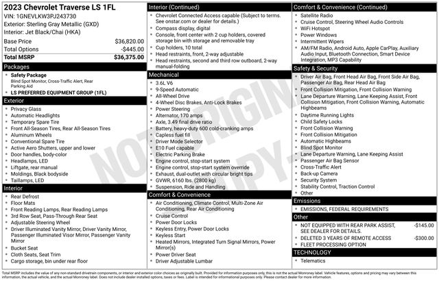 AWD, Sterling Gray Metallic, Jet Black/Chai Cloth, 2-Way Manual Front Passenger Seat Adjuster, 3.49 Axle Ratio, 3rd row seats: split-bench, 4-Wheel Disc Brakes, 6 Speakers, 6-Speaker Audio System Feature, 8-Way Power Driver Seat Adjuster, ABS brakes, Air Conditioning, Alloy wheels, AM/FM radio: SiriusXM, Apple CarPlay/Android Auto, Auto High-beam Headlights, Automatic temperature control, Brake assist, Bumpers: body-color, Compass, Delay-off headlights, Deleted 3 Years of Remote Access, Driver door bin, Driver vanity mirror, Dual front impact airbags, Dual front side impact airbags, Electronic Stability Control, Emergency communication system, Exterior Parking Camera Rear, Four wheel independent suspension, Front anti-roll bar, Front Bucket Seats, Front Center Armrest, Front dual zone A/C, Front reading lights, Fully automatic headlights, Heated door mirrors, Illuminated entry, Low tire pressure warning, Not Equipped w/Rear Park Assist (060), Occupant sensing airbag, Outside temperature display, Overhead airbag, Overhead console, Panic alarm, Passenger door bin, Passenger vanity mirror, Power door mirrors, Power Driver Lumbar Control, Power driver seat, Power steering, Power windows, Premium Cloth Seat Trim, Radio data system, Radio: Chevrolet Infotainment System AM/FM Stereo, Rear air conditioning, Rear anti-roll bar, Rear reading lights, Rear window defroster, Rear window wiper, Remote keyless entry, Security system, SiriusXM Radio, Speed control, Speed-sensing steering, Split folding rear seat, Spoiler, Steering wheel mounted audio controls, Tachometer, Telescoping steering wheel, Tilt steering wheel, Traction control, Trip computer, Turn signal indicator mirrors, Variably intermittent wipers, Voltmeter, Wheels: 18" Bright Silver Painted Aluminum, AWD, Sterling Gray Metallic, Jet Black/Chai Cloth.