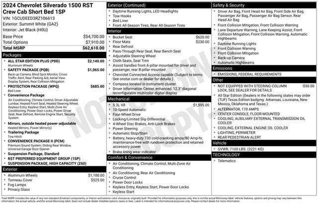 Silverado 1500 RST, Car Bravo Certified Certified, 4WD, Summit White, Black Cloth, 10-Way Power Driver Seat w/Lumbar, 120-Volt Interior Power Outlet, All Star Edition Plus, All-Star Edition, Chevytec Spray-On Black Bedliner, Convenience Package, Convenience Package II, Dual Rear USB Ports (Charge Only), Dual-Zone Automatic Climate Control, Electric Rear-Window Defogger, HD Surround Vision, Heated Driver & Front Outboard Passenger Seats, Heated Steering Wheel, Hitch Guidance, Keyless Open & Start, Perimeter Lighting, Premium Soft Roll-Up Tonneau Cover (LPO), Protection Package, Rear Cross Traffic Braking, Rear Pedestrian Alert, Rear Wheelhouse Liners, Remote Vehicle Starter System, Safety Package, Speed control, Theft Deterrent System (Unauthorized Entry), Trailer Camera Provisions, Trailer Side Blind Zone Alert, Trailering Package, Ultrasonic Front & Rear Park Assist, Wheels: 20" x 9" Painted Aluminum, Wrapped Steering Wheel, 12.3" Multicolor Reconfigurable Digital Display, 120-Volt Bed Mounted Power Outlet, 170 Amp Alternator, 2 USB Data Ports, 220 Amp Alternator, 3.23 Rear Axle Ratio, 4-Wheel Disc Brakes, 40/20/40 Front Split-Bench Seat, 6 Speakers, 6-Speaker Audio System, ABS brakes, Air Conditioning, All-Weather Floor Liner (LPO), Alloy wheels, AM/FM radio: SiriusXM with 360L, Auto High-beam Headlights, Auto-Locking Rear Differential, Automatic Emergency Braking, Automatic temperature control, Auxiliary External Transmission Oil Cooler, Bluetooth® For Phone, Brake assist, Bumpers: body-color, Chevrolet Connected Access Capable, Cloth Seat Trim, Color-Keyed Carpeting Floor Covering, Compass, Deep-Tinted Glass, Delay-off headlights, Driver door bin, Driver vanity mirror, Dual front impact airbags, Dual front side impact airbags, Electrical Steering Column Lock, Electronic Cruise Control, Electronic Stability Control, Electronic Transmission Range Selector Shifter, External Engine Oil Cooler, EZ Lift Power Lock & Release Tailgate, Floor Mounted Center Console, Following Distance Indicator, Forward Collision Alert, Front anti-roll bar, Front Bucket Seats, Front Center Armrest w/Storage, Front dual zone A/C, Front fog lights, Front Frame-Mounted Black Recovery Hooks, Front LED Fog Lamps, Front Pedestrian Braking, Front reading lights, Front Rubberized Vinyl Floor Mats, Front wheel independent suspension, Fully automatic headlights, HD Rear Vision Camera, Heated door mirrors, Heated front seats, Heated Power-Adjustable Outside Mirrors, Heated steering wheel, High Capacity Suspension Package, High Gloss Black Mirror Caps, Hitch Guidance w/Hitch View, Illuminated entry, In-Vehicle Trailering System App, Inside Rear-View Mirror w/Tilt, Integrated Trailer Brake Controller, IntelliBeam Automatic High Beam On/Off, Lane Keep Assist w/Lane Departure Warning, LED Cargo Area Lighting, Low tire pressure warning, Not Equipped w/Steering Column Lock, Occupant sensing airbag, OnStar & Chevrolet Connected Services Capable, Outside temperature display, Overhead airbag, Overhead console, Panic alarm, Passenger door bin, Passenger vanity mirror, Power door mirrors, Power driver seat, Power Front Windows w/Driver Express Up/Down, Power Front Windows w/Passenger Express Down, Power Rear Windows w/Express Down, Power Sliding Rea