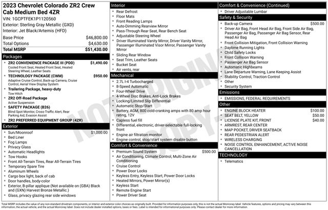 Adaptive Cruise Control, Apple CarPlay/Android Auto, Blind Zone Steering Assist, Chevy Safety Assist, Driver & Front Passenger Ventilated Seats, Driver Memory Settings, Driver Seatback Map Pocket, Electronic Automatic Cruise Control, HD Surround Vision, Heated Steering Wheel, Navigation System, Perforated Leather-Appointed Seat Trim, Preferred Equipment Group 4ZR, Rear Center Armrest, Rear Cross Traffic Braking, Rear Park Assist, Rear Pedestrian Alert, Rear-Window Electric Defogger, Safety Package, Technology Package, Wireless Charging, ZR2 Convenience Package III, ZR2 Off-Road Package, 3.42 Rear Axle Ratio, 4-Way Manual Passenger Seat Adjuster, 4-Wheel Disc Brakes, 6 Speakers, 6-Speaker Audio System Feature, 8-Way Power Driver Seat Adjuster, ABS brakes, Air Conditioning, Alloy wheels, AM/FM radio: SiriusXM, Auto High-beam Headlights, Auto-dimming Rear-View mirror, Automatic Emergency Braking, Automatic temperature control, Bose Premium 7-Speaker Audio System Feature, Brake assist, Cloth/Evotex Seat Trim, Compass, Delay-off headlights, Driver door bin, Driver vanity mirror, Dual front impact airbags, Dual front side impact airbags, Electronic Stability Control, Engine Block Heater, Following Distance Indicator, Forward Collision Alert, Front anti-roll bar, Front Bucket Seats, Front Center Armrest, Front dual zone A/C, Front fog lights, Front License Plate Kit, Front Pedestrian & Bicyclist Braking, Front reading lights, Front wheel independent suspension, Heated door mirrors, Heated Driver & Front Passenger Seats, Heated front seats, Illuminated entry, IntelliBeam Automatic High Beam On/Off, Lane Keep Assist w/Lane Departure Warning, Low tire pressure warning, Occupant sensing airbag, Outside temperature display, Overhead airbag, Overhead console, Panic alarm, Passenger door bin, Passenger Seatback Map Pocket, Passenger vanity mirror, Power door mirrors, Power Driver Lumbar Control Seat Adjuster, Power driver seat, Power Sliding Glass w/Manual Shade Sunroof, Power steering, Power windows, Radio data system, Radio: 11.3" Diagonal Advanced Color LCD Display, Rear reading lights, Rear step bumper, Rear window defroster, Remote keyless entry, Security system, SiriusXM Radio, Speed control, Speed-sensing steering, Split folding rear seat, Steering Wheel Mounted Audio Controls, Steering wheel mounted audio controls, Tachometer, Telescoping steering wheel, Tilt steering wheel, Traction control, Trip computer, Underbody Cameras, Variably intermittent wipers, Wheels: 17" x 8" Graphite & Oxide Gold Aluminum, Wireless Phone Projection, Yellow Seat Belt, One Owner Clean Carfax, Adaptive Cruise Control, Apple CarPlay/Android Auto, Blind Zone Steering Assist, Chevy Safety Assist, Driver & Front Passenger Ventilated Seats, Driver Memory Settings, Driver Seatback Map Pocket, Electronic Automatic Cruise Control, HD Surround Vision, Heated Steering Wheel, Navigation System, Perforated Leather-Appointed Seat Trim, Preferred Equipment Group 4ZR, Rear Center Armrest, Rear Cross Traffic Braking, Rear Park Assist, Rear Pedestrian Alert, Rear-Window Electric Defogger, Safety Package, Technology Package, Wireless Charging, ZR2 Convenience Package III, ZR2 Off-Road Package.