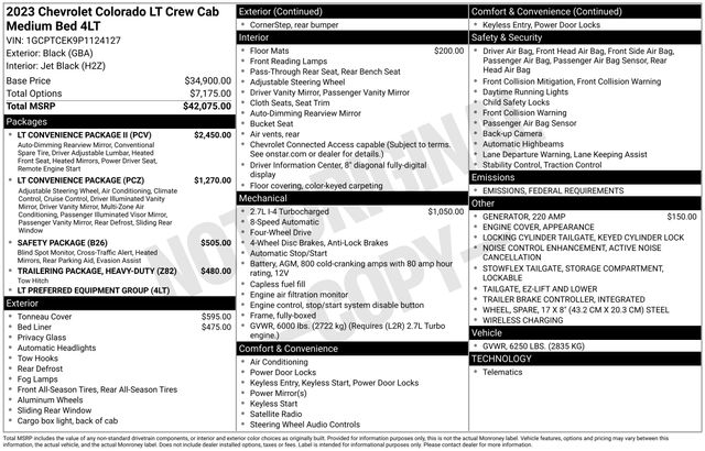 8-Way Power Driver Seat Adjuster, All-Weather Floor Mats, Apple CarPlay/Android Auto, Blind Zone Steering Assist, Driver & Front Passenger Illuminated Visors, Dual-Zone Automatic Air Conditioning, Electronic Automatic Cruise Control, EZ-Lift & Lower Tailgate, Front LED Fog Lamps, Heated Driver & Front Passenger Seats, Heated Power-Adjustable Outside Mirrors, Heavy-Duty Trailering Package, Inside Rear-View Auto-Dimming Mirror, Integrated Trailer Brake Controller, LT Convenience Package, LT Convenience Package II, Manual Rear-Sliding Window, Power Driver Lumbar Control Seat Adjuster, Rear Cross Traffic Braking, Rear Park Assist, Rear-Window Electric Defogger, Remote Vehicle Starter System, Safety Package, StowFlex Tailgate Storage Compartment, Tailgate Keyed Cylinder Lock, Tilt & Telescoping Steering Column, Wireless Charging, 1st & 2nd Row All-Weather Floor Liner (LPO), 220 Amp Generator, 3.42 Rear Axle Ratio, 4-Way Manual Passenger Seat Adjuster, 4-Wheel Disc Brakes, 6 Speakers, 6-Speaker Audio System Feature, 6-Way Manual Driver Seat Adjuster, ABS brakes, Air Conditioning, Alloy wheels, AM/FM radio: SiriusXM, Appearance Engine Cover, Auto High-beam Headlights, Automatic Emergency Braking, Black Spray-On Bedliner w/Chevrolet Logo, Brake assist, Bumpers: body-color, Chevy Safety Assist, Cloth Seat Trim, Compass, Delay-off headlights, Driver door bin, Driver vanity mirror, Dual front impact airbags, Dual front side impact airbags, Electronic Stability Control, Following Distance Indicator, Forward Collision Alert, Front anti-roll bar, Front Bucket Seats, Front Center Armrest, Front Pedestrian & Bicyclist Braking, Front reading lights, Front wheel independent suspension, Illuminated entry, IntelliBeam Automatic High Beam On/Off, Lane Keep Assist w/Lane Departure Warning, Low tire pressure warning, Navigation System, Noise Control Enhancement (DISC), Occupant sensing airbag, Outside temperature display, Overhead airbag, Overhead console, Panic alarm, Passenger door bin, Passenger Seatback Map Pocket, Passenger vanity mirror, Power door mirrors, Power steering, Power windows, Preferred Equipment Group 4LT, Radio data system, Radio: 11.3" Diagonal Advanced Color LCD Display, Rear reading lights, Rear step bumper, Remote keyless entry, Security system, SiriusXM Radio, Speed-sensing steering, Split folding rear seat, Steering Wheel Mounted Audio Controls, Steering wheel mounted audio controls, Tachometer, Tilt steering wheel, Traction control, Trip computer, Variably intermittent wipers, Vinyl Tonneau Cover w/Integrated Support Bows (LPO), Wheels: 17" x 8" Argent Metallic Aluminum, Wireless Phone Projection, 8-Way Power Driver Seat Adjuster, All-Weather Floor Mats, Apple CarPlay/Android Auto, Blind Zone Steering Assist, Driver & Front Passenger Illuminated Visors, Dual-Zone Automatic Air Conditioning, Electronic Automatic Cruise Control, EZ-Lift & Lower Tailgate, Front LED Fog Lamps, Heated Driver & Front Passenger Seats, Heated Power-Adjustable Outside Mirrors, Heavy-Duty Trailering Package, Inside Rear-View Auto-Dimming Mirror, Integrated Trailer Brake Controller, LT Convenience Package, LT Convenience Package II, Manual Rear-Sliding Window, Power Driver Lumbar Control Sea