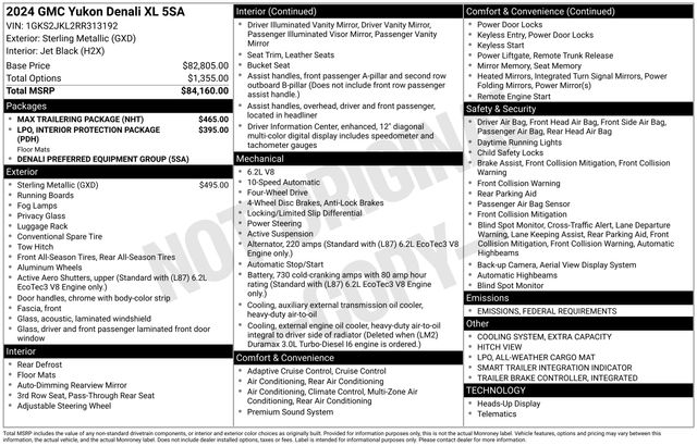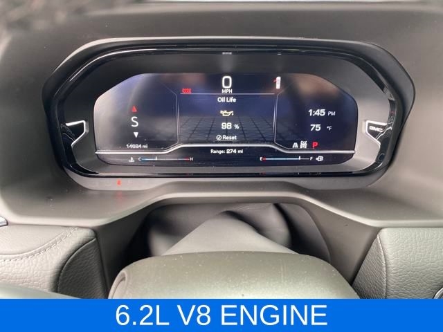 1st & 2nd Rows Premium Floor Liners (LPO), 3rd Row All-Weather Floor Liners (LPO), Adaptive Cruise Control, Advanced Security Package, Advanced Technology Package, All-Weather Cargo Mat (LPO), All-Weather Floor Mats, Apple CarPlay/Android Auto, Enhanced Automatic Parking Assist, Floor Liner Package (LPO), Glass Breakage Sensor, Hitch View, Inside Rearview Auto-Dimming Rear Camera Mirror, Interior Protection Package (LPO), Max Trailering Package, Navigation System, Power Liftgate, Rear Camera Mirror Washer, Reverse Automatic Braking, Theft-Deterrent Alarm System, Vehicle Inclination Sensor, Vehicle Interior Movement Sensor, 15" Diagonal Multi-Color Head-Up Display, 2 Presets For Outside Rearview Mirrors, 3.23 Rear Axle Ratio, 3rd Row 60/40 Power-Folding Split-Bench Seat, 3rd row seats: split-bench, 4-Wheel Disc Brakes, ABS brakes, Adaptive suspension, Air Conditioning, Air Ride Adaptive Suspension, Alloy wheels, AM/FM radio: SiriusXM with 360L, AM/FM Stereo, Auto High-beam Headlights, Auto-dimming door mirrors, Auto-dimming Rear-View mirror, Auto-leveling suspension, Automatic temperature control, Bodyside moldings, Brake assist, Bright Front & Rear Door Sill Plates, Bumpers: body-color, Chrome Door Handles w/Body-Color Strip, Compass, Delay-off headlights, Driver door bin, Driver vanity mirror, Dual Exhaust System, Dual front impact airbags, Dual front side impact airbags, Dual-Pane Panoramic Power Sunroof, Electronic Limited Slip Differential (eLSD), Electronic Stability Control, Emergency communication system: OnStar and GMC connected services capable, Enhanced Automatic Emergency Braking, Extra Capacity Cooling System, Floor Console, Four wheel independent suspension, Front anti-roll bar, Front Bucket Seats, Front Center Armrest, Front dual zone A/C, Front fog lights, Front reading lights, Fully automatic headlights, Garage door transmitter, Hands-Free Power Programmable Rear Liftgate, HD Surround Vision, Heads-Up Display, Heated 2nd Row Outboard Position Seats, Heated door mirrors, Heated Driver & Front Passenger Seats, Heated front seats, Heated rear seats, Heated Steering Wheel, Heated steering wheel, Hill Descent Control, Illuminated entry, Integrated Trailer Brake Controller, Low tire pressure warning, Magnetic Ride Control Suspension, Memory seat, Occupant sensing airbag, Outside Heated Power-Adjustable Mirrors, Outside temperature display, Overhead airbag, Overhead console, Panic alarm, Passenger door bin, Passenger vanity mirror, Perforated Heated & Ventilated Dr & Frt Pass Seats, Power door mirrors, Power driver seat, Power passenger seat, Power Release 2nd Row Bucket Seats, Power steering, Power Tilt & Telescopic Steering Column, Power windows, Power-Retractable Assist Steps, Premium Capability Package w/Active Response 4WD, Rain sensing wipers, Rear air conditioning, Rear anti-roll bar, Rear Cross Traffic Alert, Rear Pedestrian Alert, Rear reading lights, Rear Seat Media System, Rear window defroster, Rear window wiper, Remote keyless entry, Roof rack: rails only, Safety Alert Seat, Security system, SiriusXM w/360L, Smart Trailer Integration Indicator, Speed control, Speed-sensing steering, Split folding rear seat, Spoiler, Sport Pedal Cover Kit (LPO),