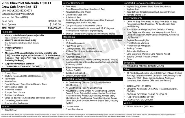 10-Way Power Driver Seat w/Lumbar, 120-Volt Interior Power Outlet, Convenience Package, Dual Rear USB Ports (Charge Only), Dual-Zone Automatic Climate Control, Heated Driver & Front Outboard Passenger Seats, Heated Steering Wheel, Keyless Open & Start, LED Cargo Area Lighting, Manual Tilt/Telescoping Steering Column, Remote Start Package, Wrapped Steering Wheel, 12.3" Multicolor Reconfigurable Digital Display, 120-Volt Bed Mounted Power Outlet, 170 Amp Alternator, 220 Amp Alternator, 3.23 Rear Axle Ratio, 4-Wheel Disc Brakes, 40/20/40 Front Split-Bench Seat, 6 Speakers, 6-Speaker Audio System, ABS brakes, Air Conditioning, All-Star Edition, Alloy wheels, AM/FM radio: SiriusXM with 360L, Apple CarPlay/Android Auto, Auto High-beam Headlights, Auto-Locking Rear Differential, Automatic Emergency Braking, Automatic temperature control, Auxiliary External Transmission Oil Cooler, Bluetooth® For Phone, Brake assist, Bumpers: chrome, Chrome Mirror Caps, Cloth Seat Trim, Color-Keyed Carpeting Floor Covering, Compass, Deep-Tinted Glass, Delay-off headlights, Driver door bin, Driver vanity mirror, Dual front impact airbags, Dual front side impact airbags, Electric Rear-Window Defogger, Electronic Cruise Control, Electronic Stability Control, Emergency communication system: OnStar, External Engine Oil Cooler, EZ Lift Power Lock & Release Tailgate, Following Distance Indicator, Forward Collision Alert, Front anti-roll bar, Front Center Armrest w/Storage, Front dual zone A/C, Front Frame-Mounted Black Recovery Hooks, Front License Plate Kit, Front Pedestrian Braking, Front reading lights, Front Rubberized Vinyl Floor Mats, Front wheel independent suspension, Fully automatic headlights, HD Rear Vision Camera, Heated door mirrors, Heated front seats, Heated Power-Adjustable Outside Mirrors, Heated steering wheel, Hitch Guidance, Illuminated entry, Inside Rear-View Mirror w/Tilt, Integrated Trailer Brake Controller, IntelliBeam Automatic High Beam On/Off, Lane Keep Assist w/Lane Departure Warning, Low tire pressure warning, Occupant sensing airbag, OnStar Services Capable, Outside temperature display, Overhead airbag, Overhead console, Panic alarm, Passenger door bin, Passenger vanity mirror, Power door mirrors, Power driver seat, Power Front Windows w/Driver Express Up/Down, Power Front Windows w/Passenger Express Down, Power Rear Windows w/Express Down, Power steering, Power windows, Preferred Equipment Group 1LT, Premium audio system: Chevrolet Infotainment 3 Premium, Radio data system, Radio: Chevrolet Infotainment 3 Premium System, Rear 60/40 Folding Bench Seat (Folds Up), Rear reading lights, Rear Rubberized-Vinyl Floor Mats, Rear step bumper, Rear window defroster, Remote keyless entry, Remote Vehicle Starter System, Security system, SiriusXM w/360L Trial Subscription, Speed control, Speed-sensing steering, Split folding rear seat, Standard Suspension Package, Standard Tailgate, Steering Wheel Audio Controls, Steering wheel mounted audio controls, Tachometer, Teen Driver, Telescoping steering wheel, Theft Deterrent System (Unauthorized Entry), Tilt steering wheel, Tire Pressure Monitoring System, Traction control, Trailering Package, Trip computer, Variably intermittent wipers, Voltmeter, Wheels: 17" x 8" Bright Sil