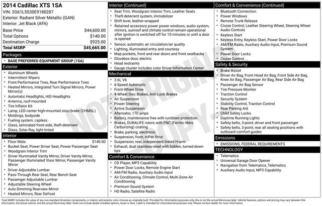 Bose Premium 8-Speaker Audio System Feature, 19" x 8.5" Aluminum w/Premium Paint Wheels, 4-Wheel Disc Brakes, 8 Speakers, ABS brakes, Adaptive suspension, Air Conditioning, All-Weather Floor Mats, Alloy wheels, AM/FM radio: SiriusXM, Auto tilt-away steering wheel, Auto-dimming Rear-View mirror, Auto-leveling suspension, Automatic temperature control, Bodyside moldings, Brake assist, Bumpers: body-color, Compass, Delay-off headlights, Driver door bin, Driver vanity mirror, Dual front impact airbags, Dual front side impact airbags, Electronic Stability Control, Emergency communication system: OnStar Directions & Connections, Four wheel independent suspension, Front anti-roll bar, Front Bucket Seats, Front Center Armrest w/Storage, Front dual zone A/C, Front reading lights, Fully automatic headlights, Garage door transmitter, Genuine wood console insert, Genuine wood dashboard insert, Heated door mirrors, High-Intensity Discharge Headlights, Illuminated entry, Knee airbag, Leather Shift Knob, Leather steering wheel, Low tire pressure warning, Occupant sensing airbag, Outside temperature display, Overhead airbag, Panic alarm, Passenger door bin, Passenger vanity mirror, Power door mirrors, Power driver seat, Power passenger seat, Power steering, Power windows, Preferred Equipment Group 1SA, Premium audio system: CUE, Radio data system, Radio: AM/FM CUE Infotainment System, Rear anti-roll bar, Rear reading lights, Rear seat center armrest, Rear side impact airbag, Rear window defroster, Remote CD player, Remote keyless entry, Security system, Single Slot CD/MP3 Player, SiriusXM Satellite & HD Radio, Soleil Keisel Leather Seating Surfaces, Speed control, Speed-sensing steering, Split folding rear seat, Spoiler, Steering wheel mounted audio controls, Tachometer, Telescoping steering wheel, Tilt steering wheel, Traction control, Trip computer, Turn signal indicator mirrors, Variably intermittent wipers, Voltmeter, Bose Premium 8-Speaker Audio System Feature.