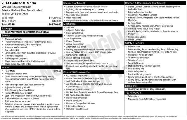 Bose Premium 8-Speaker Audio System Feature, 19" x 8.5" Aluminum w/Premium Paint Wheels, 4-Wheel Disc Brakes, 8 Speakers, ABS brakes, Adaptive suspension, Air Conditioning, All-Weather Floor Mats, Alloy wheels, AM/FM radio: SiriusXM, Auto tilt-away steering wheel, Auto-dimming Rear-View mirror, Auto-leveling suspension, Automatic temperature control, Bodyside moldings, Brake assist, Bumpers: body-color, Compass, Delay-off headlights, Driver door bin, Driver vanity mirror, Dual front impact airbags, Dual front side impact airbags, Electronic Stability Control, Emergency communication system: OnStar Directions & Connections, Four wheel independent suspension, Front anti-roll bar, Front Bucket Seats, Front Center Armrest w/Storage, Front dual zone A/C, Front reading lights, Fully automatic headlights, Garage door transmitter, Genuine wood console insert, Genuine wood dashboard insert, Heated door mirrors, High-Intensity Discharge Headlights, Illuminated entry, Knee airbag, Leather Shift Knob, Leather steering wheel, Low tire pressure warning, Occupant sensing airbag, Outside temperature display, Overhead airbag, Panic alarm, Passenger door bin, Passenger vanity mirror, Power door mirrors, Power driver seat, Power passenger seat, Power steering, Power windows, Preferred Equipment Group 1SA, Premium audio system: CUE, Radio data system, Radio: AM/FM CUE Infotainment System, Rear anti-roll bar, Rear reading lights, Rear seat center armrest, Rear side impact airbag, Rear window defroster, Remote CD player, Remote keyless entry, Security system, Single Slot CD/MP3 Player, SiriusXM Satellite & HD Radio, Soleil Keisel Leather Seating Surfaces, Speed control, Speed-sensing steering, Split folding rear seat, Spoiler, Steering wheel mounted audio controls, Tachometer, Telescoping steering wheel, Tilt steering wheel, Traction control, Trip computer, Turn signal indicator mirrors, Variably intermittent wipers, Voltmeter, Bose Premium 8-Speaker Audio System Feature.