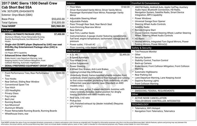 Bose Speaker System, Chrome Recovery Hooks, Denali Ultimate Package, Enhanced Driver Alert Package, Forward Collision Alert, Integrated Trailer Brake Controller, IntelliBeam Automatic High Beam On/Off Headlight, Lane Keep Assist, Low Speed Forward Automatic Braking, Navigation System, Power Sunroof, Tri-Mode Power Steps, Wheels: 22" Aluminum w/Premium Paint, 110-Volt AC Power Outlet, 150 Amp Alternator, 1st & 2nd Row Color-Keyed Carpeted Floor Mats, 2-Speed Active Electronic AutoTrac Transfer Case, 3.23 Rear Axle Ratio, 3.42 Rear Axle Ratio, 4-Wheel Disc Brakes, 6" Rectangular Chromed Tubular Assist Steps, 7 Speakers, 8" Multi-Color Customizable Driver Display, ABS brakes, Active Noise Cancellation, Adaptive suspension, Adjustable pedals, Air Conditioning, Alloy wheels, AM/FM radio, Auto High-beam Headlights, Auto-dimming door mirrors, Auto-Dimming Inside Rear-View Mirror, Auto-dimming Rear-View mirror, Automatic temperature control, Body Color Lower Front Bumper, Body Color Rear Bumper w/Cornersteps, Bodyside moldings, Brake assist, Bumpers: body-color, CD player, Chrome Bodyside Moldings, Chrome Door Handles, Chrome Mirror Caps, Color-Keyed Carpeting, Compass, Deep-Tinted Glass, Delay-off headlights, Driver & Front Passenger Illuminated Vanity Mirrors, Driver door bin, Driver vanity mirror, Dual front impact airbags, Dual front side impact airbags, Dual-Zone Automatic Climate Control, Electric Rear-Window Defogger, Electronic Stability Control, Emergency communication system: OnStar Guidance, Exterior Parking Camera Rear, EZ Lift & Lower Tailgate, Floor Mounted Console, Front & Rear All-Weather Floor Mats, Front anti-roll bar, Front Center Armrest w/Storage, Front dual zone A/C, Front fog lights, Front Frame-Mounted Black Recovery Hooks, Front Full Feature Power Reclining Bucket Seats, Front reading lights, Front wheel independent suspension, Fully automatic headlights, Garage door transmitter: HomeLink, HD Radio, Heated & Ventilated Front Bucket Seats, Heated door mirrors, Heated front seats, Heated steering wheel, Illuminated entry, Leather Wrapped Heated Steering Wheel, Low tire pressure warning, MagneRide Magnetic Ride Control Suspension, Manual Tilt/Telescoping Steering Column, Memory seat, Occupant sensing airbag, OnStar 3 Month Guidance Plan, OnStar w/4G LTE, Outside temperature display, Overhead airbag, Overhead console, Panic alarm, Passenger door bin, Passenger vanity mirror, Perforated Leather Appointed Seat Trim, Polished Exhaust Tip, Power Adjustable Pedals, Power door mirrors, Power driver seat, Power Folding & Adjustable Heated Outside Mirrors, Power passenger seat, Power Sliding Rear Window w/Defogger, Power steering, Power windows, Power Windows w/Driver Express Up & Down, Preferred Equipment Group 5SA, Radio data system, Radio: AM/FM Stereo w/8" Diagonal Color Touch Nav., Rear 60/40 Folding Bench Seat (Folds Up), Rear reading lights, Rear seat center armrest, Rear step bumper, Rear Vision Camera, Rear Wheelhouse Liners, Rear window defroster, Remote Keyless Entry, Remote keyless entry, Remote Locking Tailgate, Remote Vehicle Starter System, Security system, Single Slot CD/MP3 Player, SiriusXM Satellite Radio, Speed control, Speed-sensing steering, Split folding rear seat, Steering Wheel Audio Controls, Steering wheel mounted audio controls, Tachometer, Telescoping steering wheel, Theft Deterrent System (Unauthorized Entry), Thin Profile LED Fog Lamps, Tilt steering wheel, Traction control, Trailering Equipment, Trip computer, Turn signal indicator mirrors, Ultrasonic Front & Rear Park Assist, Universal Home Remote, Variably intermittent wipers, Ventilated fr