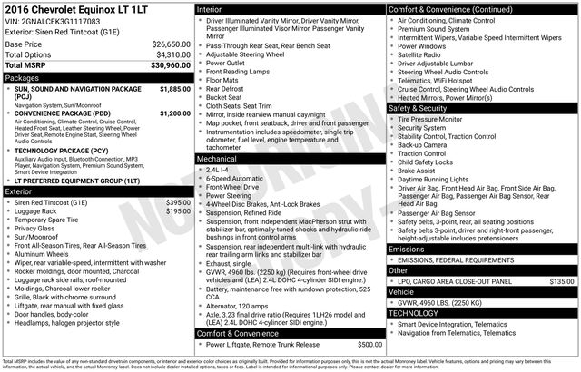 8-Way Power Driver Seat Adjuster, Air Conditioning w/Automatic Climate Control, Convenience Package, Heated Driver & Front Passenger Seats, Leather-Wrapped Steering Wheel w/Audio/Cruise Ctrls, Pioneer Premium Audio System Feature, Radio: Chevrolet MyLink Audio System w/Navigation, Remote Vehicle Starter System, Technology Package, 17" Aluminum Wheels, 3.23 Axle Ratio, 4-Wheel Disc Brakes, 6 Speaker Audio System Feature, 6 Speakers, ABS brakes, Air Conditioning, Alloy wheels, AM/FM radio: SiriusXM, Black Roof Rack Cross Bars, Bluetooth® For Phone, Brake assist, Bumpers: body-color, Cargo Area Close-Out Panel (LPO), Compass, Delay-off headlights, Deluxe Front Bucket Seats, Driver door bin, Driver vanity mirror, Dual front impact airbags, Dual front side impact airbags, E10 Fuel Capable, Electronic Stability Control, Emergency communication system: OnStar Guidance, Equipment Group 1LT, Exterior Parking Camera Rear, Four wheel independent suspension, Front anti-roll bar, Front Bucket Seats, Front Center Armrest, Front reading lights, Fully automatic headlights, Heated door mirrors, Illuminated entry, Low tire pressure warning, Manual Climate Control, Occupant sensing airbag, Outside temperature display, Overhead airbag, Panic alarm, Passenger door bin, Passenger vanity mirror, Power door mirrors, Power driver seat, Power Programmable Rear Liftgate, Power steering, Power Tilt-Sliding Sunroof w/Express-Open, Power windows, Premium audio system: Chevrolet MyLink, Premium Cloth Seat Trim, Radio data system, Radio: Chevrolet MyLink Audio System, Rear anti-roll bar, Rear seat center armrest, Rear window defroster, Rear window wiper, Remote keyless entry, Roof rack: rails only, Security system, SiriusXM Satellite Radio, Speed control, Speed-sensing steering, Split folding rear seat, Spoiler, Steering wheel mounted audio controls, Sun, Sound & Navigation Package, Tachometer, Telescoping steering wheel, Tilt steering wheel, Traction control, Trip computer, Universal Home Remote, Variably intermittent wipers, 8-Way Power Driver Seat Adjuster, Air Conditioning w/Automatic Climate Control, Convenience Package, Heated Driver & Front Passenger Seats, Leather-Wrapped Steering Wheel w/Audio/Cruise Ctrls, Pioneer Premium Audio System Feature, Radio: Chevrolet MyLink Audio System w/Navigation, Remote Vehicle Starter System, Technology Package.