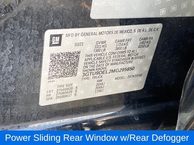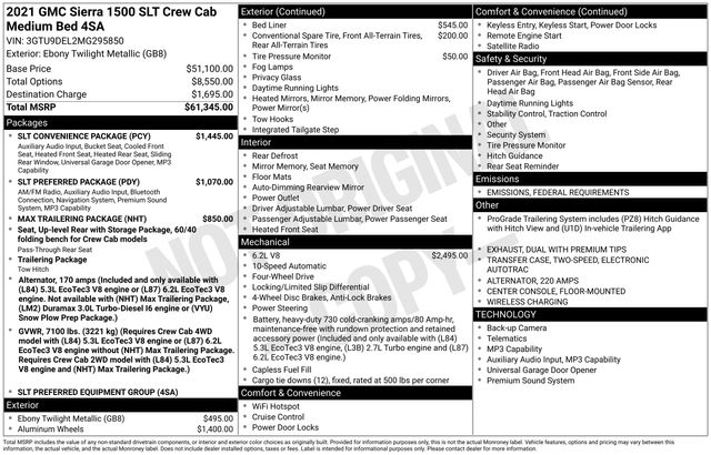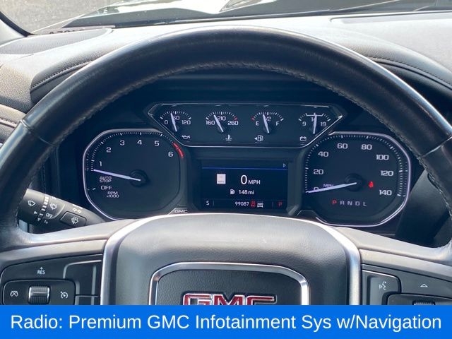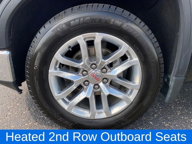 2 USB Ports, 2 USB Ports (1st Row), 20" x 9" Polished Aluminum Wheels, 220 Amp Alternator, 3.42 Rear Axle Ratio w/Max Trailering Pkg, Apple CarPlay/Android Auto, Enhanced Cooling Radiator, Floor-Mounted Center Console, Front Bucket Seats, Heated 2nd Row Outboard Seats, Heavier Duty Rear Springs, Increased RGAWR, Max Trailering Package, Navigation System, Power Sliding Rear Window w/Rear Defogger, Premium Bose 7-Speaker Sound System, Radio: Premium GMC Infotainment Sys w/Navigation, SLT Convenience Package, SLT Preferred Package, Speed control, Spray-On Pickup Bed Liner w/GMC Logo, Universal Home Remote, Ventilated Driver & Front Passenger Seats, Wireless Charging, 10-Way Power Driver Seat Adjuster w/Lumbar, 10-Way Power Passenger Seat Adjuster w/Lumbar, 12-Volt Rear Auxiliary Power Outlet, 120-Volt Bed Mounted Power Outlet, 120-Volt Instrument Panel Power Outlet, 170 Amp Alternator, 3.23 Rear Axle Ratio, 4-Wheel Disc Brakes, 4G LTE Wi-Fi Hotspot Capable, 6 Speakers, 6-Speaker Audio System Feature, ABS brakes, Air Conditioning, Alloy wheels, AM/FM radio: SiriusXM with 360L, Auto-dimming door mirrors, Auto-dimming Rear-View mirror, Auto-Locking Rear Differential, Automatic temperature control, Auxiliary External Transmission Oil Cooler, Brake assist, Bumpers: chrome, Chrome Grille, Color-Keyed Carpeting Floor Covering, Compass, Deep-Tinted Glass, Delay-off headlights, Driver door bin, Driver Memory, Driver vanity mirror, Dual Exhaust w/Premium Tips, Dual front impact airbags, Dual front side impact airbags, Electric Rear-Window Defogger, Electrical Lock Control Steering Column, Electronic Stability Control, Front 40/20/40 Split-Bench Seat, Front anti-roll bar, Front Center Armrest w/Storage, Front dual zone A/C, Front fog lights, Front Frame-Mounted Black Recovery Hooks, Front reading lights, Front wheel independent suspension, Fully automatic headlights, GMC Connected Access Capable, Heated door mirrors, Heated Driver & Front Outboard Passenger Seating, Heated front seats, Heated steering wheel, Heavy Duty Suspension, Hitch Guidance, Hitch Guidance w/Hitch View, Illuminated entry, In-Vehicle Trailering App, Integrated Trailer Brake Controller, Keyless Open & Start, LED Cargo Area Lighting, Low tire pressure warning, Manual Tilt-Wheel & Telescoping Steering Column, Memory seat, Occupant sensing airbag, OnStar & GMC Connected Services Capable, Outside temperature display, Overhead airbag, Overhead console, Panic alarm, Passenger door bin, Passenger vanity mirror, Perf Leather-Appointed Front Outboard Seat Trim, Power Door Locks, Power door mirrors, Power driver seat, Power Front Passenger Windows w/Express Up/Down, Power Front Windows w/Driver Express Up/Down, Power passenger seat, Power Rear Windows w/Express Down, Power steering, Power windows, Preferred Equipment Group 4SA, Premium audio system: GMC Infotainment System, ProGrade Trailering System, Radio data system, Radio: Premium GMC Infotainment Sys w/Multi-Touch, Rear Dual USB Charging-Only Ports, Rear reading lights, Rear seat center armrest, Rear step bumper, Rear Wheelhouse Liners, Rear window defroster, Remote keyless entry, Remote Vehicle Starter System, Security system, SiriusXM w/360L, Speed-sensing steerin