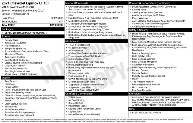 17" Aluminum Wheels, 2 Rear USB Charging-Only Ports, 2 USB Ports & Auxiliary Input Jack, 2-Way Power Driver Lumbar Control Seat Adjuster, 3.87 Final Drive Axle Ratio, 4-Wheel Disc Brakes, 6 Speaker Audio System Feature, 6 Speakers, 8-Way Power Driver Seat Adjuster, ABS brakes, Air Conditioning, Alloy wheels, AM/FM radio: SiriusXM, Apple CarPlay/Android Auto, Auto High-beam Headlights, Bluetooth® For Phone, Brake assist, Bumpers: body-color, Compass, Delay-off headlights, Driver door bin, Driver vanity mirror, Dual front impact airbags, Dual front side impact airbags, Electronic Stability Control, Emergency communication system: OnStar and Chevrolet connected services capable, Four wheel independent suspension, Front anti-roll bar, Front Bucket Seats, Front Center Armrest, Front Passenger 4-Way Manual Seat Adjuster, Front reading lights, Fully automatic headlights, Heated door mirrors, High-Intensity Discharge Headlights, Illuminated entry, Low tire pressure warning, Occupant sensing airbag, Outside temperature display, Overhead airbag, Overhead console, Panic alarm, Passenger door bin, Passenger vanity mirror, Power door mirrors, Power driver seat, Power steering, Power windows, Preferred Equipment Group 1LT, Premium audio system: Chevrolet Infotainment 3, Premium Cloth Seat Trim, Radio data system, Radio: Chevrolet Infotainment 3 System w/AM/FM, Rear anti-roll bar, Rear reading lights, Rear seat center armrest, Rear window defroster, Rear window wiper, Remote keyless entry, Security system, SiriusXM Radio, Speed control, Speed-sensing steering, Split folding rear seat, Spoiler, Steering wheel mounted audio controls, Tachometer, Telescoping steering wheel, Tilt steering wheel, Traction control, Trip computer, Variably intermittent wipers.