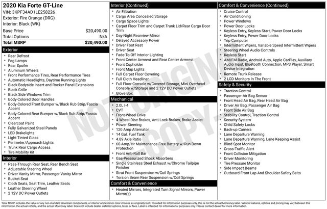 4-Wheel Disc Brakes, 6 Speakers, ABS brakes, Air Conditioning, Alloy wheels, AM/FM radio, Apple CarPlay & Android Auto, Brake assist, Bumpers: body-color, Cloth & Leatherette Seat Trim, Delay-off headlights, Driver door bin, Driver vanity mirror, Dual front impact airbags, Dual front side impact airbags, Electronic Stability Control, Exterior Parking Camera Rear, Front anti-roll bar, Front Bucket Seats, Front Center Armrest, Front fog lights, Front reading lights, Front Sport Seats, Front wheel independent suspension, Fully automatic headlights, Heated door mirrors, Illuminated entry, Leather Shift Knob, Leather steering wheel, Low tire pressure warning, Occupant sensing airbag, Overhead airbag, Overhead console, Panic alarm, Passenger door bin, Passenger vanity mirror, Power door mirrors, Power steering, Power windows, Radio data system, Radio: AM/FM/MP3 Audio System, Rear seat center armrest, Rear window defroster, Remote keyless entry, Security system, Speed control, Split folding rear seat, Spoiler, Steering wheel mounted audio controls, Tachometer, Telescoping steering wheel, Tilt steering wheel, Traction control, Trip computer, Turn signal indicator mirrors, Variably intermittent wipers, Wheels: 17" Graphite Finish Alloy.