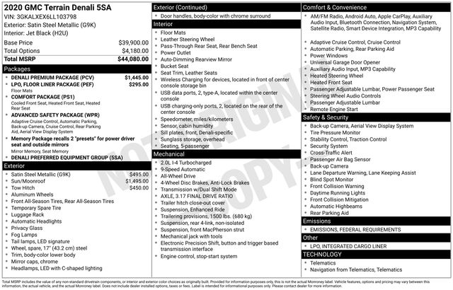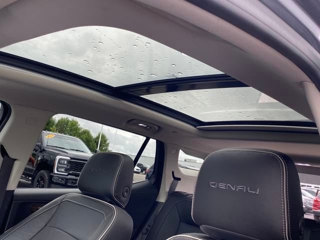 Adaptive Cruise Control - Camera, Advanced Safety Package, Automatic Parking Assist, Comfort Package, Denali Premium Package, HD Surround Vision, Heated Rear Outboard Seating Positions, Navigation System, Ventilated Driver Seat, Ventilated Front Passenger Seat, 2 USB Data Ports, 2 USB Data Ports w/SD Card Reader, 3.17 Axle Ratio, 4-Wheel Disc Brakes, 6-Way Power Front Passenger Seat, 7 Speakers, 8-Way Power Driver Seat Adjuster, ABS brakes, Air Conditioning, Alloy wheels, AM/FM radio: SiriusXM, Apple CarPlay/Android Auto, Auto High-beam Headlights, Auto-dimming door mirrors, Auto-dimming Rear-View mirror, Automatic temperature control, Bluetooth® For Phone, Brake assist, Bumpers: body-color, Compass, Delay-off headlights, Driver & Front Passenger Heated Seats, Driver door bin, Driver vanity mirror, Dual front impact airbags, Dual front side impact airbags, Electronic Stability Control, Emergency communication system: OnStar and GMC connected services capable, Exterior Parking Camera Rear, Factory Installed Trailer Hitch, Floor Liner Package (LPO), Four wheel independent suspension, Front & Rear All-Weather Floor Liners (LPO), Front anti-roll bar, Front Bucket Seats, Front Center Armrest, Front dual zone A/C, Front fog lights, Front Passenger 2-Way Power Lumbar, Front reading lights, Fully automatic headlights, Garage door transmitter, HD Radio, Heated door mirrors, Heated front seats, Heated steering wheel, Illuminated entry, Integrated Cargo Liner (LPO), Lane Departure Warning System, Low tire pressure warning, Memory seat, Occupant sensing airbag, Outside temperature display, Overhead airbag, Overhead console, Panic alarm, Passenger door bin, Passenger vanity mirror, Perforated Leather-Appointed Seat Trim w/Denali Logo, Power door mirrors, Power Driver Lumbar Control, Power driver seat, Power Liftgate, Power passenger seat, Power steering, Power windows, Preferred Equipment Group 5SA, Premium 7-Speaker Bose Sound System w/Amplifier, Radio data system, Radio: GMC Infotainment System w/Navigation, Rear anti-roll bar, Rear seat center armrest, Rear window defroster, Rear window wiper, Remote keyless entry, Roof rack: rails only, Security system, SiriusXM Radio, Skyscape Power Sunroof w/Power Sunscreen, Speed control, Speed-sensing steering, Split folding rear seat, Spoiler, Steering wheel mounted audio controls, Tachometer, Telescoping steering wheel, Tilt steering wheel, Traction control, Trailering Equipment, Trip computer, Turn signal indicator mirrors, Variably intermittent wipers, Wheels: 19" x 7.5" Ultra-Bright Machined Aluminum, Adaptive Cruise Control - Camera, Advanced Safety Package, Automatic Parking Assist, Comfort Package, Denali Premium Package, HD Surround Vision, Heated Rear Outboard Seating Positions, Navigation System, Ventilated Driver Seat, Ventilated Front Passenger Seat.