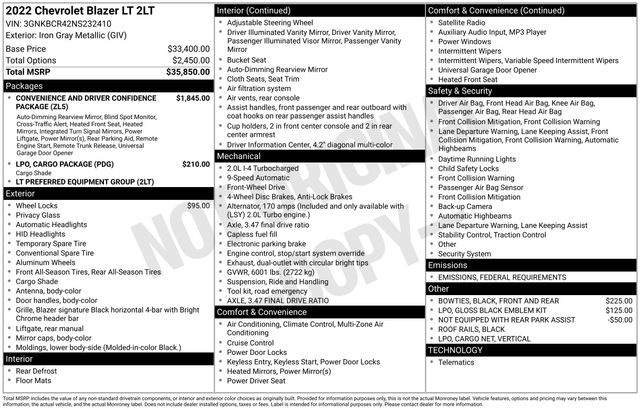 Apple CarPlay/Android Auto, Black Roof Rails, Cargo Package (LPO), Convenience & Driver Confidence Package, Exterior Parking Camera Rear, Gloss Black Emblem Kit (LPO), Heated Driver & Front Passenger Seats, Inside Rear-View Auto-Dimming Mirror, Lane Change Alert w/Side Blind Zone Alert, Outside Heated Power-Adjustable Body-Color Mirrors, Preferred Equipment Group 2LT, Rear Cross Traffic Alert, Rear Park Assist w/Audible Warning, Rear Power Programmable Liftgate, Remote Start, Retractable Cargo Shade, Speed control, Universal Home Remote, Vertical Cargo Net (LPO), 170 Amp Alternator, 3.47 Final Drive Axle Ratio, 4-Wheel Disc Brakes, 6 Speakers, 6-Speaker Audio System Feature, ABS brakes, Air Conditioning, Alloy wheels, AM/FM radio: SiriusXM, Auto High-beam Headlights, Automatic temperature control, Brake assist, Bright Wheel Locks (LPO), Bumpers: body-color, Child-Seat-Sensing Airbag, Compass, Delay-off headlights, Driver door bin, Driver vanity mirror, Dual front impact airbags, Dual front side impact airbags, Electronic Stability Control, Emergency communication system: OnStar and Chevrolet connected services capable, Four wheel independent suspension, Front & Rear Black Bowties, Front anti-roll bar, Front Bucket Seats, Front Center Armrest, Front dual zone A/C, Front reading lights, Fully automatic headlights, Heated door mirrors, High-Intensity Discharge Headlights, Illuminated entry, Knee airbag, Leather Shift Knob, Low tire pressure warning, Not Equipped w/Rear Park Assist, Occupant sensing airbag, Outside temperature display, Overhead airbag, Overhead console, Panic alarm, Passenger door bin, Passenger vanity mirror, Power door mirrors, Power driver seat, Power steering, Power windows, Premium Cloth Seat Trim, Radio data system, Radio: Chevrolet Infotainment 3 System, Rear anti-roll bar, Rear reading lights, Rear seat center armrest, Rear window defroster, Rear window wiper, Remote keyless entry, Ride & Handling Suspension, Security system, SiriusXM Radio, Speed-sensing steering, Split folding rear seat, Spoiler, Steering wheel mounted audio controls, Tachometer, Telescoping steering wheel, Tilt steering wheel, Traction control, Trip computer, Variably intermittent wipers, Voltmeter, Wheels: 18" Bright Silver Aluminum, One Owner Clean Carfax, One Owner, Clean Carfax, Apple CarPlay/Android Auto, Black Roof Rails, Cargo Package (LPO), Convenience & Driver Confidence Package, Exterior Parking Camera Rear, Gloss Black Emblem Kit (LPO), Heated Driver & Front Passenger Seats, Inside Rear-View Auto-Dimming Mirror, Lane Change Alert w/Side Blind Zone Alert, Outside Heated Power-Adjustable Body-Color Mirrors, Preferred Equipment Group 2LT, Rear Cross Traffic Alert, Rear Park Assist w/Audible Warning, Rear Power Programmable Liftgate, Remote Start, Retractable Cargo Shade, Speed control, Universal Home Remote, Vertical Cargo Net (LPO).