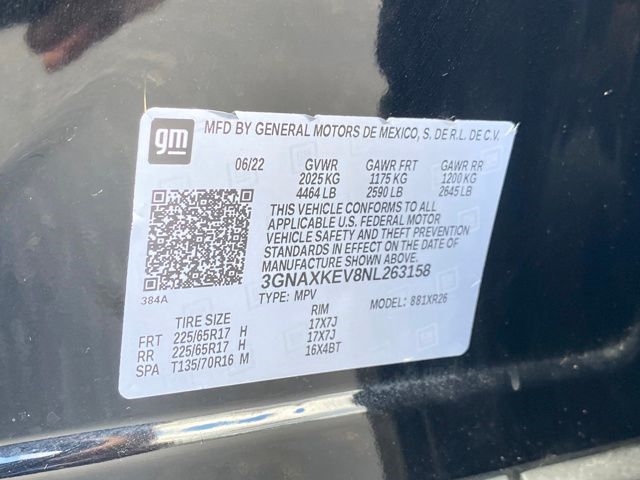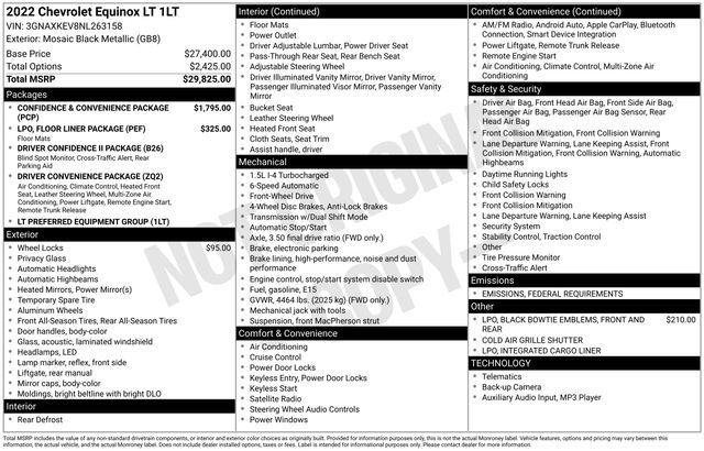 Confidence & Convenience Package, Driver Confidence II Package, Driver Convenience Package, 17" Aluminum Wheels, 2 Rear USB Charging-Only Ports, 2 USB Ports & Auxiliary Input Jack, 2-Way Power Driver Lumbar Control Seat Adjuster, 3-Spoke Leather-Wrapped Steering Wheel, 3.50 Final Drive Axle Ratio, 4-Wheel Disc Brakes, 6 Speaker Audio System Feature, 6 Speakers, 8-Way Power Driver Seat Adjuster, ABS brakes, Air Conditioning, All-Weather Floor Liners (LPO), Alloy wheels, AM/FM radio: SiriusXM, Auto High-beam Headlights, Bluetooth® For Phone, Brake assist, Bumpers: body-color, Cold Air Grille Shutter, Compass, Delay-off headlights, Driver door bin, Driver vanity mirror, Dual front impact airbags, Dual front side impact airbags, Dual Zone Automatic Climate Control, Electronic Stability Control, Emergency communication system: OnStar and Chevrolet connected services capable, Floor Liner Package (LPO), Four wheel independent suspension, Front & Rear Park Assist, Front anti-roll bar, Front Bucket Seats, Front Center Armrest, Front Passenger 4-Way Manual Seat Adjuster, Front reading lights, Fully automatic headlights, Heated door mirrors, Heated Driver & Front Passenger Seats, Illuminated entry, Integrated Cargo Liner (LPO), Lane Change Alert w/Side Blind Zone Alert, Low tire pressure warning, Occupant sensing airbag, Outside temperature display, Overhead airbag, Overhead console, Panic alarm, Passenger door bin, Passenger vanity mirror, Power door mirrors, Power driver seat, Power steering, Power windows, Preferred Equipment Group 1LT, Premium audio system: Chevrolet Infotainment 3, Premium Cloth Seat Trim, Radio data system, Radio: Chevrolet Infotainment 3 System w/AM/FM, Rear anti-roll bar, Rear Cross Traffic Alert, Rear Power Liftgate, Rear reading lights, Rear seat center armrest, Rear window defroster, Rear window wiper, Remote keyless entry, Remote Start, Security system, Set of 4 Wheel Locks (LPO), SiriusXM Radio, Speed control, Speed-sensing steering, Split folding rear seat, Spoiler, Steering wheel mounted audio controls, Tachometer, Telescoping steering wheel, Tilt steering wheel, Traction control, Trip computer, Variably intermittent wipers, Wireless Apple CarPlay/Wireless Android Auto, Confidence & Convenience Package, Driver Confidence II Package, Driver Convenience Package.