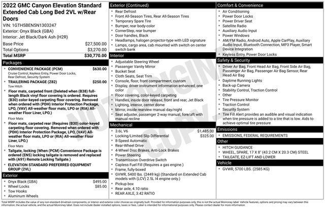 4-Wheel Disc Brakes, 6 Speakers, 6-Speaker Audio System Feature, ABS brakes, Air Conditioning, Alloy wheels, AM/FM radio: SiriusXM, Apple CarPlay/Android Auto, Automatic Locking Rear Differential, Bumpers: body-color, Convenience Package, Delay-off headlights, Driver 4-Way Power Seat Adjuster, Driver door bin, Dual front impact airbags, Dual front side impact airbags, Electronic Automatic Cruise Control, Electronic Stability Control, Exterior Parking Camera Rear, EZ-Lift & Lower Tailgate, Front anti-roll bar, Front Bucket Seats, Front Center Armrest, Front wheel independent suspension, Fully automatic headlights, Hitch Guidance, Low tire pressure warning, Occupant sensing airbag, Overhead airbag, Passenger door bin, Passenger vanity mirror, Power driver seat, Power steering, Power windows, Preferred Equipment Group 2VL, Premium audio system: GMC Infotainment System, Radio data system, Radio: AM/FM w/7" Diagonal Color Touch-Screen, Rear step bumper, Rear-Window Electric Defogger, Remote Keyless Entry, Remote Locking Tailgate, SiriusXM Radio, Speed-sensing steering, Split folding rear seat, Tachometer, Tilt steering wheel, Tow/Haul Mode, Traction control, Trailering Package, Trip computer, Unauthorized Entry Theft-Deterrent System, Variably intermittent wipers, Vinyl Seat Trim, Wheel Locks (Set of 4) (LPO), Wheels: 18" x 8.5" Black Painted Aluminum.
