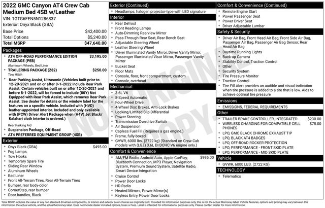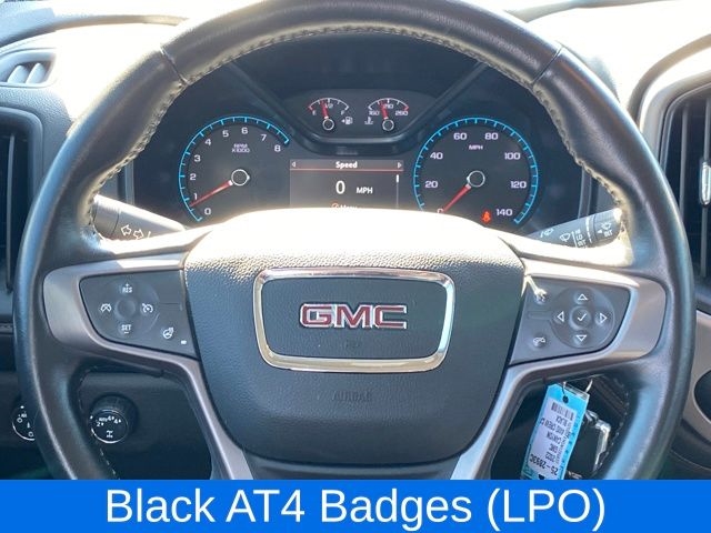 1st & 2nd Rows All-Weather Floor Liner (LPO), AT4 Off-Road Performance Edition Package, Black AT4 Badges (LPO), Black Spray-On Bedliner w/GMC Logo, Bose Premium 7-Speaker Audio System Feature, GMC Black Chrome Exhaust Tip (LPO), Off-Road Rocker Protection (LPO), Suspension Leveling Kit (LPO), Trailering Package, Wheels: 17" x 8" Gloss-Black Aluminum, 2 USB Data Ports, 3.42 Rear Axle Ratio, 4-Way Power Front Passenger Seat Adjuster, 4-Wheel Disc Brakes, 6 Speakers, 6-Speaker Audio System Feature, ABS brakes, Air Conditioning, Alloy wheels, AM/FM radio: SiriusXM with 360L, Apple CarPlay/Android Auto, Auto-dimming Rear-View mirror, Automatic temperature control, Bumpers: body-color, Compass, Delay-off headlights, Driver 6-Way Power Seat Adjuster, Driver door bin, Driver Instrument Information Enhanced Display, Driver vanity mirror, Dual front impact airbags, Dual front side impact airbags, Electronic Stability Control, Emergency communication system: OnStar and GMC Connected Services capable, Exterior Parking Camera Rear, Front anti-roll bar, Front Bucket Seats, Front Center Armrest, Front fog lights, Front reading lights, Front wheel independent suspension, Fully automatic headlights, HD Radio, Heated door mirrors, Heated Steering Wheel, Heated steering wheel, Hitch Guidance, Illuminated entry, Integrated Trailer Brake Controller, Leather-Appointed Seat Trim, Low tire pressure warning, Occupant sensing airbag, Outside temperature display, Overhead airbag, Overhead console, Panic alarm, Passenger door bin, Passenger vanity mirror, Power door mirrors, Power Driver Lumbar Control Seat Adjuster, Power driver seat, Power Passenger Lumbar Control Seat Adjuster, Power passenger seat, Power steering, Power windows, Preferred Equipment Group 4SB, Premium audio system: GMC Infotainment System, Radio data system, Radio: AM/FM w/8" Diagonal Multi-Touch Display, Radio: AM/FM w/8" Diagonal Multi-Touch Display Nav, Rear reading lights, Rear seat center armrest, Rear step bumper, Rear window defroster, Remote keyless entry, Security system, SiriusXM Radio, Speed control, Speed-sensing steering, Steering wheel mounted audio controls, Tachometer, Telescoping steering wheel, Tilt steering wheel, Tow/Haul Mode, Traction control, Trip computer, Variably intermittent wipers, Wheels: 17" x 8" Dark Argent Metallic, Wireless Charging for Compatible Cell Phones, 1st & 2nd Rows All-Weather Floor Liner (LPO), AT4 Off-Road Performance Edition Package, Black AT4 Badges (LPO), Black Spray-On Bedliner w/GMC Logo, Bose Premium 7-Speaker Audio System Feature, GMC Black Chrome Exhaust Tip (LPO), Off-Road Rocker Protection (LPO), Suspension Leveling Kit (LPO), Trailering Package, Wheels: 17" x 8" Gloss-Black Aluminum.
