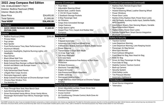 ABS brakes, Active Cruise Control, Alloy wheels, Compass, Electronic Stability Control, Front dual zone A/C, Heated door mirrors, Heated front seats, Illuminated entry, Low tire pressure warning, ParkView Rear Back-Up Camera, Passenger door bin, Remote keyless entry, Traction control.