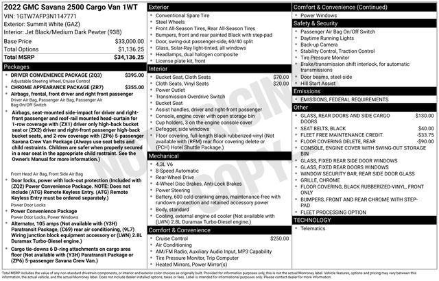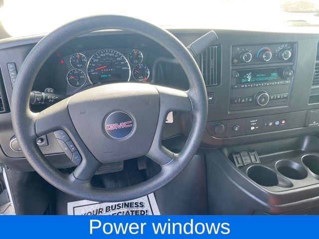 3.42 Rear Axle Ratio, Chrome Appearance Package, Chrome Grille, Cruise Control, Driver Convenience Package, Front & Rear Chrome Bumpers w/Step-Pad, Power steering, Power windows, Preferred Equipment Group 1WT, Tilt Steering Wheel, 16" x 6.5" Steel Wheels, 2 Speakers, 4-Wheel Disc Brakes, ABS brakes, Air Conditioning, AM/FM radio, AM/FM Stereo w/MP3 Player, Black Rubberized-Vinyl Front Only Floor Covering, Delay-off headlights, Driver & Front Passenger High-Back Bucket Seats, Driver door bin, Driver's Seat Mounted Armrest, Dual front impact airbags, Dual front side impact airbags, Electronic Stability Control, Emergency communication system: OnStar and GMC Connected Services capable, Engine Cover Console w/Swing-Out Storage Bin, Fixed Rear Door Window Glass, Fixed Rear Side Door Window Glass, Front anti-roll bar, Front Bucket Seats, Front Reclining High-Back Bucket Seats, Front wheel independent suspension, Full-Length Black Rubberized-Vinyl Floor Covering, Fully automatic headlights, Heated door mirrors, Low tire pressure warning, Occupant sensing airbag, Overhead airbag, Passenger cancellable airbag, Passenger door bin, Passenger seat mounted armrest, Power door mirrors, Rear & Side Cargo Door Glass, Rear Side Door Glass Window Security Bar, Reclining Front Bucket Seats w/Inboard Armrests, Seat-Mounted & Roof-Rail Side-Impact Airbags, Single-Zone Manual Air Conditioning, Tachometer, Traction control, Trip computer, Variably intermittent wipers, Vinyl Seat Trim, Voltmeter, One Owner, 3.42 Rear Axle Ratio, Chrome Appearance Package, Chrome Grille, Cruise Control, Driver Convenience Package, Front & Rear Chrome Bumpers w/Step-Pad, Power steering, Power windows, Preferred Equipment Group 1WT, Tilt Steering Wheel.