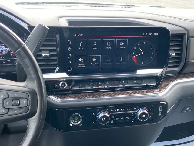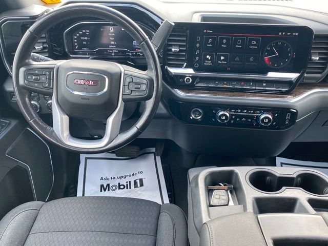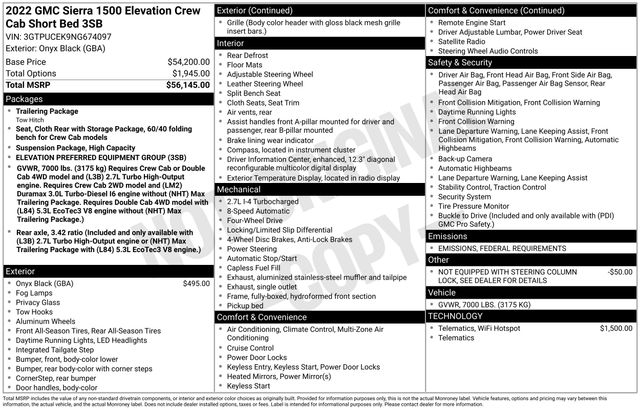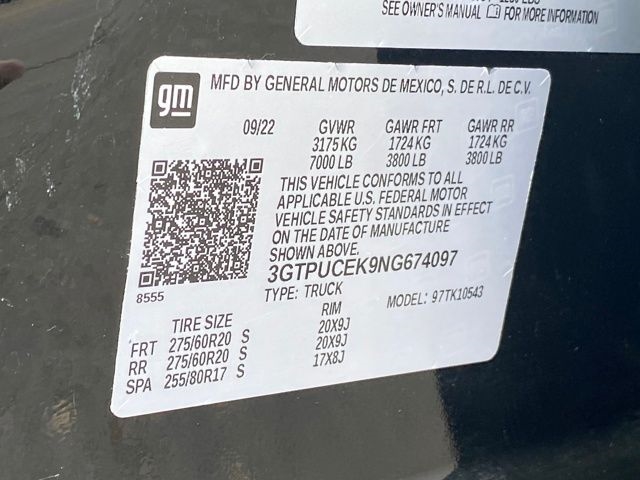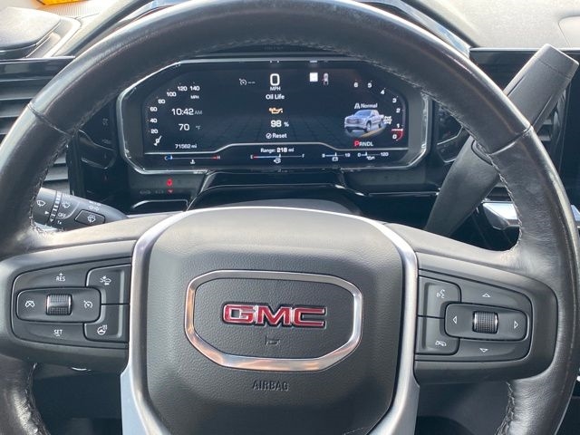 Navigation System, 10-Way Power Driver Seat Adjuster w/Lumbar, 120-Volt Bed Mounted Power Outlet, 120-Volt Instrument Panel Power Outlet, 2 Charge/Data USB Ports, 2 Type-C Charge-Only Rear USB Ports, 220 Amp Alternator, 3 Years of OnStar & Connected Services Plan, 4-Way Manual Passenger Seat Adjuster, 4-Wheel Disc Brakes, 6 Speakers, 6-Speaker Audio System Feature, ABS brakes, Air Conditioning, Alloy wheels, AM/FM radio: SiriusXM with 360L, Apple CarPlay/Android Auto, Auto High-beam Headlights, Auto-Locking Rear Differential, Automatic Emergency Braking, Automatic temperature control, Body Color Header w/Gloss Black Mesh Grille Bars, Brake assist, Buckle to Drive, Bumpers: body-color, Cloth Rear Seat w/Storage Package, Cloth Seat Trim, Color-Keyed Carpeting Floor Covering, Compass, Deep-Tinted Glass, Delay-off headlights, Driver door bin, Driver vanity mirror, Dual front impact airbags, Dual front side impact airbags, Electric Rear-Window Defogger, Electrical Steering Column Lock, Electronic Stability Control, Emergency communication system: OnStar and GMC Connected Services capable, Exterior Parking Camera Rear, Following Distance Indicator, Forward Collision Alert, Front 40/20/40 Split-Bench Seat, Front anti-roll bar, Front Center Armrest w/Storage, Front dual zone A/C, Front fog lights, Front Frame-Mounted Black Recovery Hooks, Front Pedestrian Braking, Front reading lights, Front Rubberized-Vinyl Floor Mats, Front wheel independent suspension, Fully automatic headlights, GMC Connected Access Capable, HD Rear Vision Camera, Heated door mirrors, Heated Driver & Front Outboard Passenger Seating, Heated front seats, Heated Steering Wheel, Heated steering wheel, High Capacity Suspension Package, Hitch Guidance, Illuminated entry, IntelliBeam Automatic High Beam On/Off, Keyless Open & Start, Lane Keep Assist w/Lane Departure Warning, LED Cargo Area Lighting, Low tire pressure warning, Manual Tilt-Wheel & Telescoping Steering Column, Not Equipped w/Steering Column Lock, Occupant sensing airbag, OnStar & GMC Connected Services Capable, Outside temperature display, Overhead airbag, Overhead console, Panic alarm, Passenger door bin, Passenger vanity mirror, Power Door Locks, Power door mirrors, Power driver seat, Power Front Windows w/Driver Express Up/Down, Power Front Windows w/Passenger Express Down, Power Rear Windows w/Express Down, Power steering, Power windows, Preferred Equipment Group 3SB, Premium audio system: GMC Infotainment System, Push Button Start, Radio data system, Radio: Premium GMC Infotainment Audio System, Rear reading lights, Rear Rubberized-Vinyl Floor Mats, Rear seat center armrest, Rear step bumper, Rear window defroster, Remote keyless entry, Remote Vehicle Starter System, Security system, SiriusXM w/360L, Speed control, Speed-sensing steering, Split folding rear seat, Steering Wheel Audio Controls, Steering wheel mounted audio controls, Tachometer, Telescoping steering wheel, Theft Deterrent System (Unauthorized Entry), Tilt steering wheel, Traction control, Trailering Package, Trip computer, Variably intermittent wipers, Voltmeter, Wheels: 20" x 9" High Gloss Black Painted Aluminum, Wi-Fi Hotspot Capable, Wireless Phone Projection, Navigation Sy