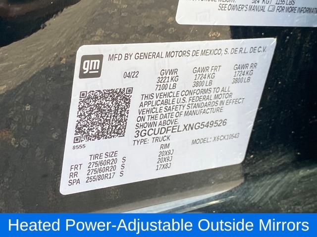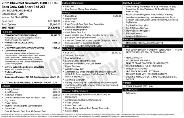 10-Way Power Driver Seat w/Lumbar, 12.3" Multicolor Reconfigurable Digital Display, 120-Volt Instrument Panel Power Outlet, 6-Speaker Audio System, All-Weather Floor Liner (LPO) (AAK), Apple CarPlay/Android Auto, Auto-Locking Rear Differential, Black Name Plates (LPO), Bluetooth® For Phone, Color-Keyed Carpeting Floor Covering, Compass, Convenience Package, Convenience Package II, Dark Essentials Package (LPO), Deep-Tinted Glass, Dual Rear USB Ports (Charge Only), Dual-Zone Automatic Climate Control, Electric Rear-Window Defogger, Electrical Steering Column Lock, Electronic Cruise Control, EZ Lift Power Lock & Release Tailgate, Front LED Fog Lamps, HD Rear Vision Camera, Heated Driver & Front Outboard Passenger Seats, Heated Power-Adjustable Outside Mirrors, Heated Steering Wheel, High Gloss Black Mirror Caps, Hitch Guidance w/Hitch View, Inside Rear-View Mirror w/Tilt, Integrated Trailer Brake Controller, Keyless Open & Start, Leather Wrapped Steering Wheel, LED Cargo Area Lighting, Manual Tilt/Telescoping Steering Column, OnStar & Chevrolet Connected Services Capable, Performance Red Recovery Hooks, Power Front Windows w/Driver Express Up/Down, Power Front Windows w/Passenger Express Down, Power Rear Windows w/Express Down, Power Sliding Rear Window w/Rear Defogger, Power Sunroof, Preferred Equipment Group 2LT, Premium Bose 7-Speaker Sound System, Rear 60/40 Folding Bench Seat (Folds Up), Remote Vehicle Starter System, SiriusXM w/360L, Standard Tailgate, Steering Wheel Audio Controls, Theft Deterrent System (Unauthorized Entry), Trailering App, Trailering Package, Universal Home Remote, Wireless Phone Projection, 120-Volt Bed Mounted Power Outlet, 170 Amp Alternator, 2 USB Data Ports, 220 Amp Alternator, 3.23 Rear Axle Ratio, 3.42 Rear Axle Ratio, 4-Wheel Disc Brakes, 40/20/40 Front Split-Bench Seat, 6 Speakers, ABS brakes, Air Conditioning, Alloy wheels, AM/FM radio: SiriusXM with 360L, Auto High-beam Headlights, Automatic Emergency Braking, Automatic temperature control, Auxiliary External Transmission Oil Cooler, Black Tailgate CHEVROLET Lettering (LPO), Brake assist, Chevrolet Connected Access Capable, Chevytec Spray-On Black Bedliner, Cloth Seat Trim, Delay-off headlights, Driver door bin, Driver vanity mirror, Dual Exhaust w/Polished Outlets, Dual front impact airbags, Dual front side impact airbags, Electronic Stability Control, Electronic Transmission Range Selector Shifter, External Engine Oil Cooler, Floor Mounted Center Console, Following Distance Indicator, Forward Collision Alert, Front anti-roll bar, Front Bucket Seats, Front Center Armrest w/Storage, Front dual zone A/C, Front fog lights, Front Pedestrian Braking, Front reading lights, Front wheel independent suspension, Fully automatic headlights, Heated door mirrors, Heated front seats, Heated steering wheel, Heavy-Duty Air Filter, Hill Descent Control, Hitch Guidance, Illuminated entry, IntelliBeam Automatic High Beam On/Off, Lane Keep Assist w/Lane Departure Warning, Low tire pressure warning, Not Equipped w/Heated/Ventilated Front Seats, Occupant sensing airbag, Off-Road Assist Steps (LPO), Outside temperature display, Overhead airbag, Overhead console, Panic alarm, Passenger door bin, Passenge