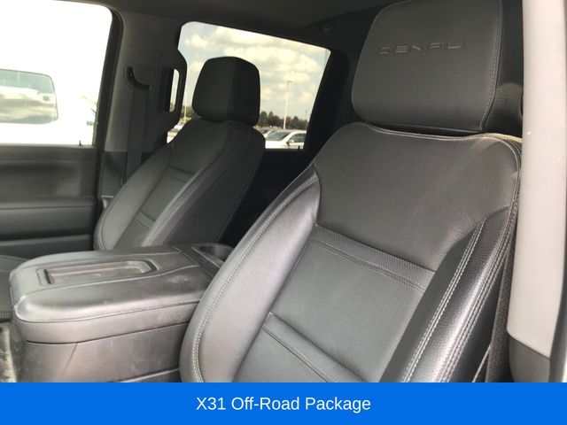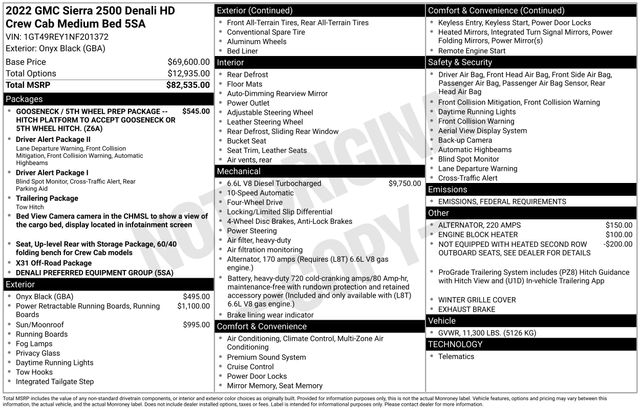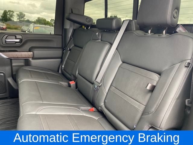 Automatic Emergency Braking, Driver Alert Package I, Driver Alert Package II, Following Distance Indicator, Forward Collision Alert, Hill Descent Control, IntelliBeam Automatic High Beam On/Off, Lane Change Alert w/Side Blind Zone Alert, Lane Departure Warning System, Navigation System, Rear Cross Traffic Alert, X31 Off-Road Package, 10-Way Power Driver Seat Adjuster w/Lumbar, 10-Way Power Passenger Seat Adjuster w/Lumbar, 12-Volt Rear Auxiliary Power Outlet, 120-Volt Bed Mounted Power Outlet, 120-Volt Instrument Panel Power Outlet, 2 USB Ports, 2 USB Ports (1st Row), 2-Speed Active Transfer Case, 220 Amps Alternator, 2nd Row Dual USB Charge-Only Ports, 3.42 Axle Ratio, 3.73 Rear Axle Ratio, 4-Wheel Disc Brakes, 6" Rectangular Chromed Tubular Assist Steps, 7 Speakers, ABS brakes, Air Conditioning, Alloy wheels, AM/FM radio: SiriusXM with 360L, Apple CarPlay/Android Auto, Auto High-beam Headlights, Auto-dimming door mirrors, Auto-dimming Rear-View mirror, Automatic temperature control, Bed View Camera w/2 Trailer Camera Provisions, Bose Premium 7 Speaker Sound System, Brake assist, Bumpers: body-color, Compass, Compass Located In Instrument Cluster, Deep-Tinted Glass, Delay-off headlights, Driver door bin, Driver Memory, Driver vanity mirror, Dual front impact airbags, Dual front side impact airbags, Electric Rear-Window Defogger, Electrical Lock Control Steering Column, Electronic Stability Control, Emergency communication system: OnStar and GMC Connected Services capable, Engine Block Heater, Exhaust Brake, Exterior Parking Camera Rear, Floor-Mounted Center Console, Forge Perforated Leather-Appointed Front Seat Trim, Front anti-roll bar, Front Bucket Seats, Front Center Armrest, Front Chrome Recovery Hooks, Front dual zone A/C, Front fog lights, Front reading lights, Front wheel independent suspension, Fully automatic headlights, Garage door transmitter, Genuine wood console insert, Genuine wood door panel insert, GMC Connected Access Capable, Gooseneck/5th Wheel Prep Package, HD Surround Vision w/2 Trailer View Camera Provisions, Heated & Ventilated Front Bucket Seats, Heated door mirrors, Heated Driver & Front Outboard Passenger Seats, Heated front seats, Heated steering wheel, Heavy-Duty 80 Amp Battery, Hitch Guidance w/Hitch View, Illuminated entry, In-Vehicle Trailering System App, Integrated Trailer Brake Controller, Keyless Open & Start, LED Cargo Area Lighting, LED Smoked Amber Roof Marker Lamps, Low tire pressure warning, Manual Tilt-Wheel/Telescoping Steering Column, Memory seat, Not Equipped w/Heated 2nd Row Outboard Seats, Occupant sensing airbag, Off-Road Suspension, OnStar & GMC Connected Services Capable, Outside temperature display, Overhead airbag, Overhead console, Panic alarm, Passenger door bin, Passenger vanity mirror, Pickup Box, Polished Exhaust Tip, Power Door Locks, Power door mirrors, Power driver seat, Power Front Passenger Windows w/Express Up/Down, Power passenger seat, Power Rear Windows w/Express Down, Power Sliding Rear Window w/Defogger, Power steering, Power Sunroof, Power windows, Power Windows w/Driver Express Up/Down, Power-Retractable Assist Steps, Preferred Equipment Group 5SA, Premium audio system: Premium GMC Infotainment System, Radio: AM/FM w/Prem GMC Infotainment System & Navi, Rear reading lights, Rear seat center armrest, Rear step bumper, Rear Wheelhouse Liners, Rear window defroster, Remote keyless entry, Remote Vehicle Starter System, Safety Alert Seat, Security system, Signature Denali Grille, SiriusXM w/360L, Speed control, Speed-sensing steering, Split folding rear seat, Spray-On Pickup Box Bed Liner w/Denali Logo, Steering Wheel Audio Controls, Steering wheel mounted audio controls, Tachometer, Telescoping steering wheel, Tilt steering wheel, Traction control, Trip comp