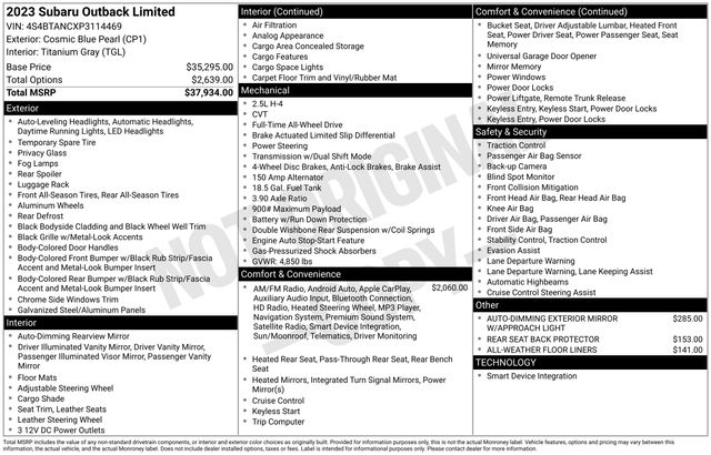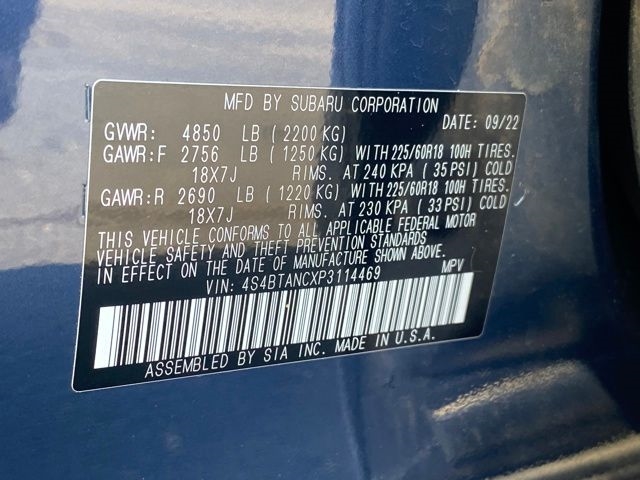 DriverFocus (Driver Monitoring System), Heated Steering Wheel, Power Moonroof, Power Moonroof & HSW & Navigation System, Radio: Subaru STARLINK 11.6" Multimedia Nav System, 12 Speakers, 3.90 Axle Ratio, 4-Wheel Disc Brakes, ABS brakes, Air Conditioning, All-Weather Floor Liners, Alloy wheels, AM/FM radio: SiriusXM, Auto High-beam Headlights, Auto-Dimming Exterior Mirror w/Approach Light, Auto-dimming Rear-View mirror, Automatic temperature control, Brake assist, Bumpers: body-color, Compass, Driver door bin, Driver vanity mirror, Dual front impact airbags, Dual front side impact airbags, Electronic Stability Control, Emergency communication system: STARLINK Safety Plus (3-year free trial), Exterior Parking Camera Rear, Four wheel independent suspension, Front anti-roll bar, Front Bucket Seats, Front Center Armrest w/Storage, Front dual zone A/C, Front fog lights, Front reading lights, Fully automatic headlights, Garage door transmitter: HomeLink, harman/kardon® Speakers, Heated door mirrors, Heated Front Bucket Seats, Heated front seats, Heated rear seats, Illuminated entry, Knee airbag, Leather Shift Knob, Leather steering wheel, Low tire pressure warning, Memory seat, Occupant sensing airbag, Outside temperature display, Overhead airbag, Overhead console, Panic alarm, Passenger door bin, Passenger vanity mirror, Perforated Leather-Trimmed Upholstery, Power door mirrors, Power driver seat, Power Liftgate, Power passenger seat, Power steering, Power windows, Radio: Subaru STARLINK 11.6" Multimedia Plus Sys, Rear anti-roll bar, Rear Seat Back Protector, Rear seat center armrest, Rear window defroster, Rear window wiper, Remote keyless entry, Roof rack, Security system, Speed control, Speed-sensing steering, Split folding rear seat, Spoiler, Steering wheel mounted audio controls, Steering Wheel Paddle Shift Control Switches, Tachometer, Telescoping steering wheel, Tilt steering wheel, Traction control, Trip computer, Turn signal indicator mirrors, Variably intermittent wipers, Wheels: 18" x 7J Black Aluminum Alloy, DriverFocus (Driver Monitoring System), Heated Steering Wheel, Power Moonroof, Power Moonroof & HSW & Navigation System, Radio: Subaru STARLINK 11.6" Multimedia Nav System.
