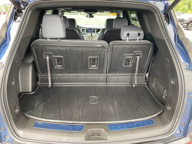18" Aluminum Wheels, 1st & 2nd Row All-Weather Floor Liners (LPO), 3.49 Axle Ratio, 3rd Row All-Weather Floor Liner (LPO), 3rd row seats: split-bench, 4-Wheel Disc Brakes, 6 Speakers, 6-Speaker Audio System Feature, 6-Way Power Front Passenger Seat Adjuster, 7-Passenger Seating, 8-Way Power Driver Seat Adjuster, ABS brakes, Air Conditioning, Alloy wheels, AM/FM radio: SiriusXM with 360L, Auto High-beam Headlights, Auto-dimming door mirrors, Auto-dimming Rear-View mirror, Automatic temperature control, Brake assist, Bumpers: body-color, Chrome Thatcham Wheel Locks (LPO), Compass, Delay-off headlights, Driver door bin, Driver vanity mirror, Dual front impact airbags, Dual front side impact airbags, Electronic Stability Control, Emergency communication system: OnStar and Buick connected services capable, Floor Liner Package (LPO), Four wheel independent suspension, Front & Rear Park Assist, Front anti-roll bar, Front Bucket Seats, Front Center Armrest, Front dual zone A/C, Front reading lights, Fully automatic headlights, Garage door transmitter, Heated door mirrors, Heated Driver & Front Passenger Seats, Heated front seats, Heated Steering Wheel, Heated steering wheel, Illuminated entry, Integrated Cargo Liner (LPO), Leather steering wheel, Low tire pressure warning, Occupant sensing airbag, Outside temperature display, Overhead airbag, Overhead console, Panic alarm, Passenger door bin, Passenger vanity mirror, Perforated Leather-Appointed Seat Trim, Power door mirrors, Power Driver Lumbar Control Seat Adjuster, Power driver seat, Power Liftgate, Power Passenger Lumbar Control Seat Adjuster, Power passenger seat, Power steering, Power windows, Preferred Equipment Group 1SL, Premium audio system: Buick Infotainment System, Radio data system, Radio: Buick Infotainment System AM/FM Stereo, Rear air conditioning, Rear anti-roll bar, Rear reading lights, Rear window defroster, Rear window wiper, Remote keyless entry, Roof rack: rails only, Security system, SiriusXM w/360L, Speed control, Speed-sensing steering, Spoiler, Steering wheel mounted audio controls, Tachometer, Telescoping steering wheel, Tilt steering wheel, Traction control, Trip computer, Turn signal indicator mirrors, Variably intermittent wipers, Voltmeter, Wireless Apple CarPlay/Wireless Android Auto.