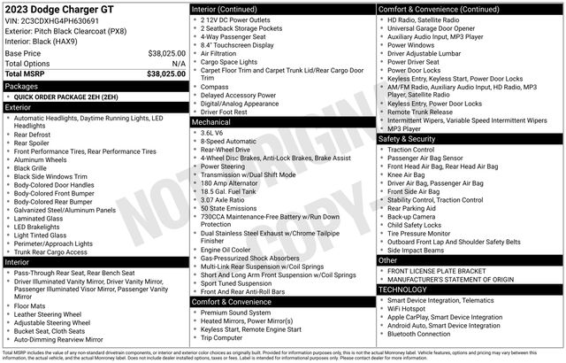1-Yr SiriusXM Guardian Trial, 2-Piece Shark Fin Antenna, 4-Wheel Disc Brakes, 4G LTE Wi-Fi Hot Spot, 6 Speakers, 8.4" Touchscreen Display, ABS brakes, Air Conditioning, Alloy wheels, AM/FM radio: SiriusXM, Anti-whiplash front head restraints, Apple CarPlay, Apple CarPlay/Android Auto, Auto-dimming Rear-View mirror, Automatic temperature control, Brake assist, Bumpers: body-color, Cloth Performance Seats, Compass, Delay-off headlights, Driver door bin, Driver vanity mirror, Dual front impact airbags, Dual front side impact airbags, Electronic Stability Control, Emergency communication system: SiriusXM Guardian, For Details, Visit DriveUconnect.com, Four wheel independent suspension, Front anti-roll bar, Front Bucket Seats, Front Center Armrest, Front dual zone A/C, Front License Plate Bracket, Front reading lights, Fully automatic headlights, Garage door transmitter: HomeLink, Google Android Auto, GPS Antenna Input, HD Radio, Heated door mirrors, Illuminated entry, Integrated Center Stack Radio, Integrated Voice Command w/Bluetooth, Knee airbag, Leather Shift Knob, Low tire pressure warning, Manufacturer's Statement of Origin, Media Hub (2 USB, AUX), Occupant sensing airbag, Outside temperature display, Overhead airbag, Overhead console, Panic alarm, ParkView Rear Back-Up Camera, Passenger door bin, Passenger vanity mirror, Power 2-Way Driver Lumbar Adjust, Power 8-Way Driver Seat, Power door mirrors, Power driver seat, Power steering, Power windows, Quick Order Package 2EH, Radio: Uconnect 4C w/8.4" Display, Rear anti-roll bar, Rear Armrest w/Cupholder Seat, Rear reading lights, Rear seat center armrest, Rear window defroster, Remote keyless entry, Speed control, Speed-Sensitive Wipers, Split folding rear seat, Spoiler, Steering wheel mounted audio controls, Tachometer, Telescoping steering wheel, Tilt steering wheel, Traction control, Trip computer, USB Host Flip, Variably intermittent wipers, Wheels: 20" x 8" Satin Carbon Painted.